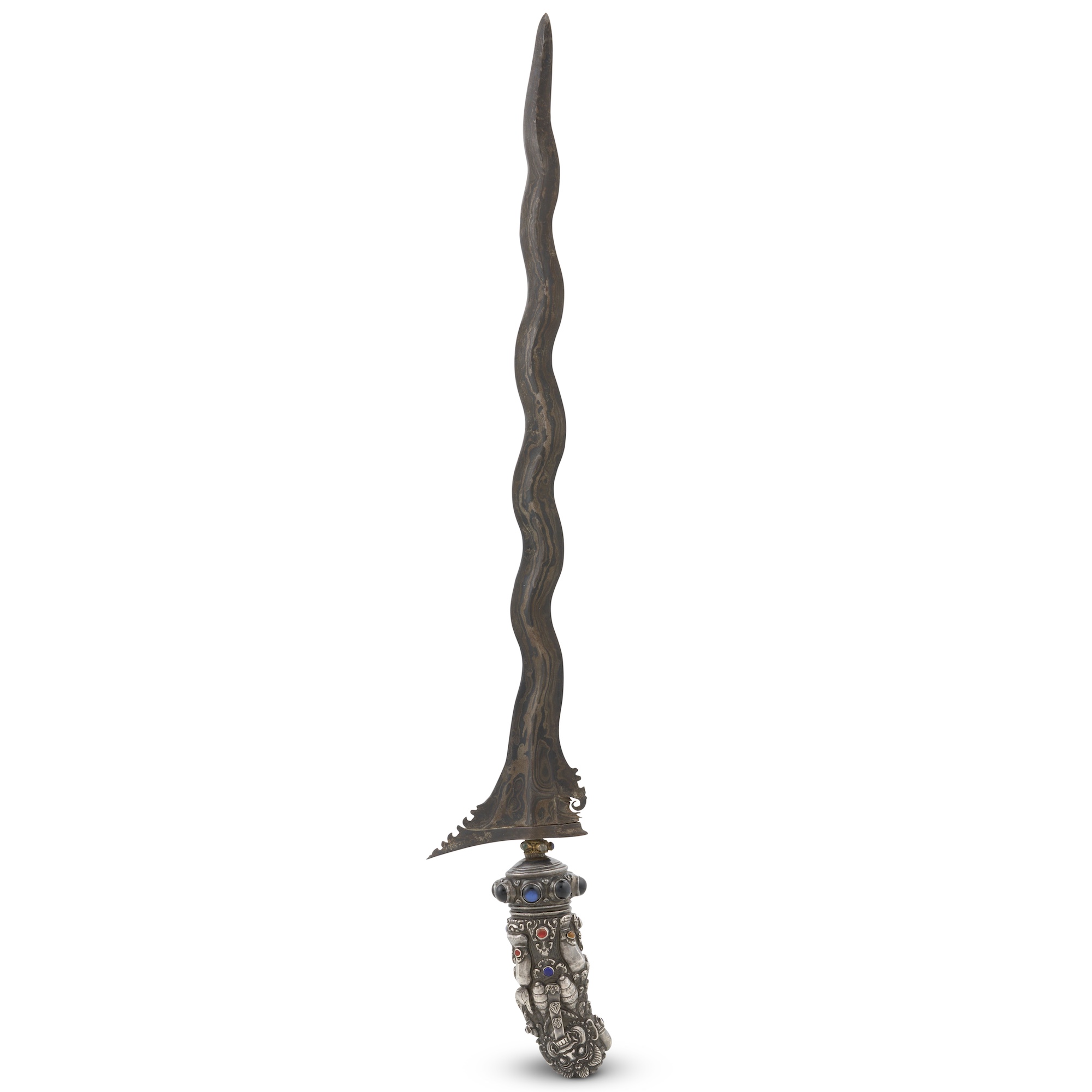 The hilt modelled as a figure of Batara Bayu set with variously coloured and sized glass cabochons mounted to an eleven-luk damascened blade of back and bronze pamor