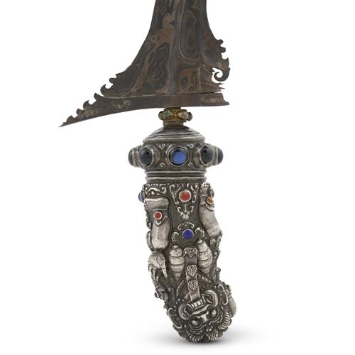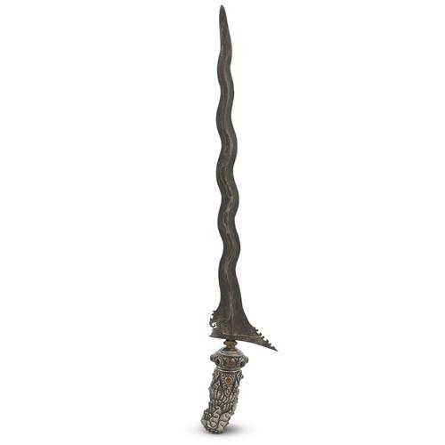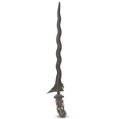 AN ANTIQUE BALINESE KRIS WITH JEWELLED SILVER HILT