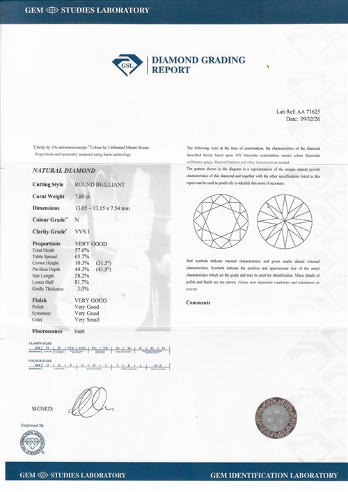 Accompanied by a GSL report numbered AA71625 dated 9 February 2026, stating that the 7.80 carat diamond is natural, N colour, VVS1 clarity.