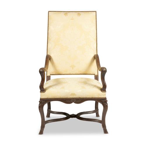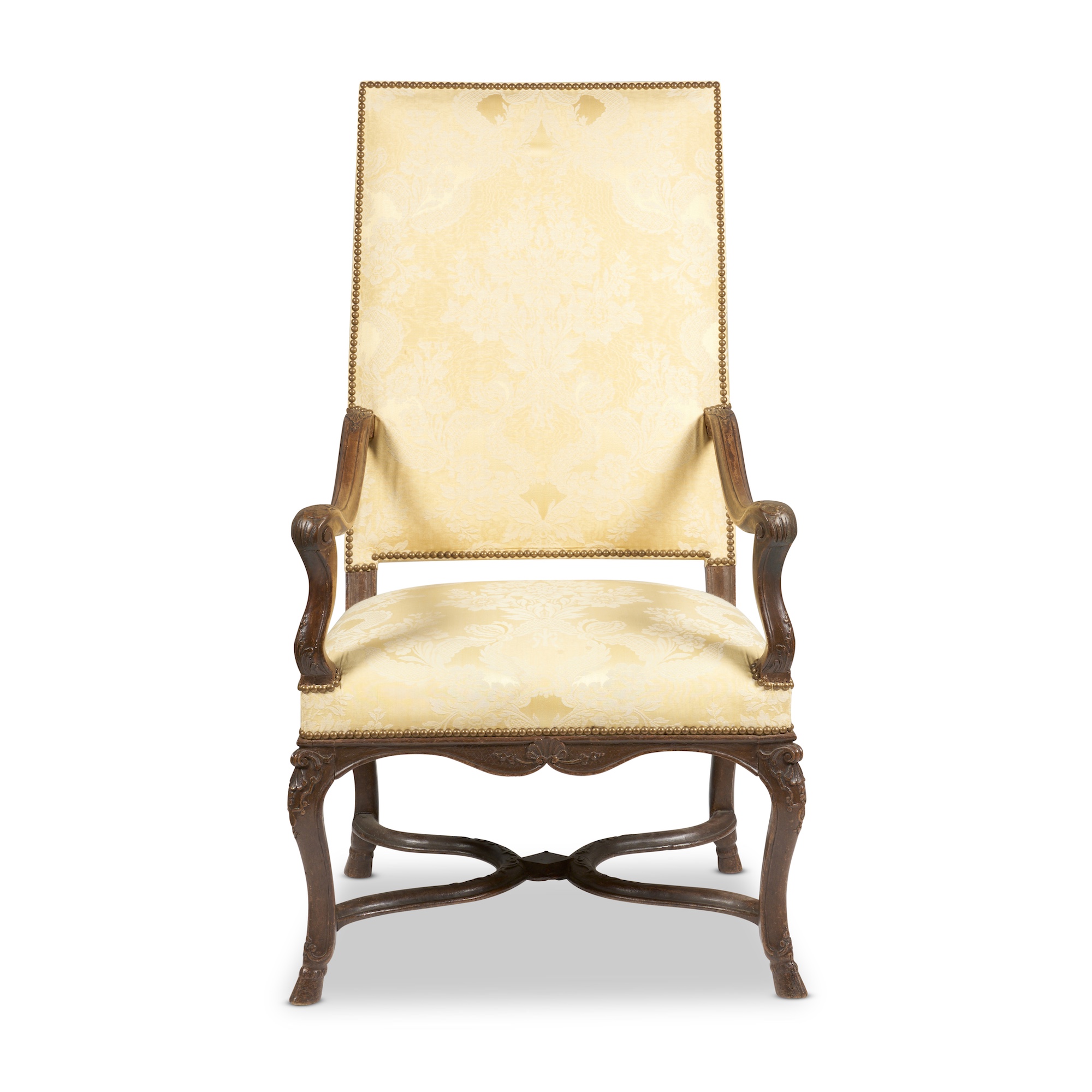The tall raked square back and downswept open arms above the upholstered seat on shaped rails, on hoof-footed cabriole supports joined with curving cross-stretchers, the frame moulded and with carved decorative details, in close-nailed pale lemon damask fabric