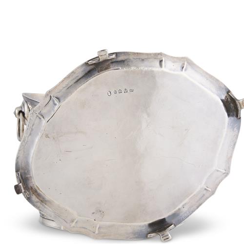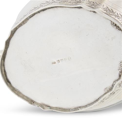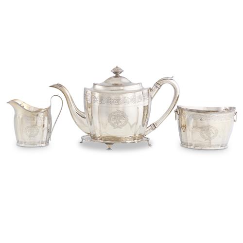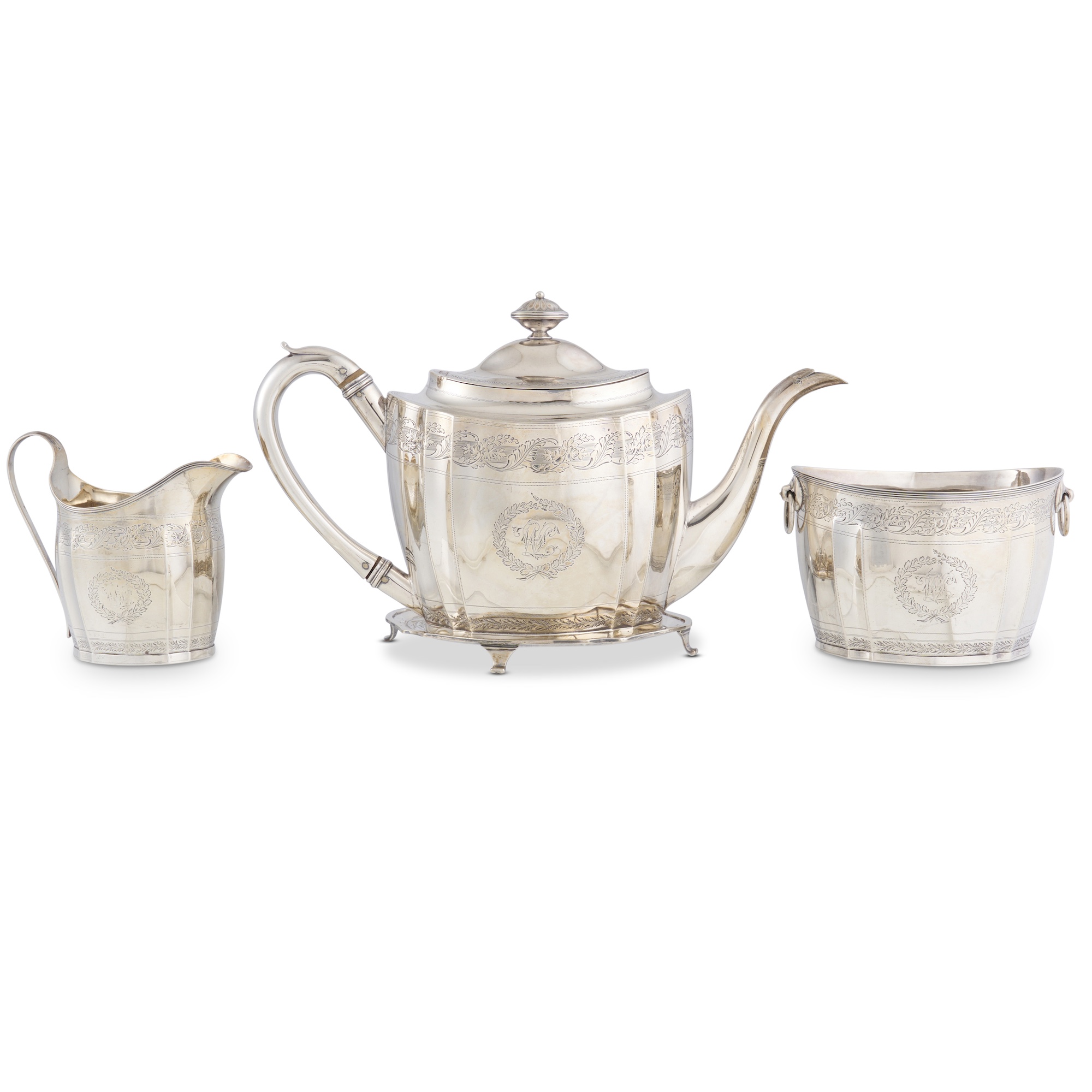 A tea pot and stand on feet, ring-handled sugar basin, and cream jug, the vessels of oval outline with a pair of flutes each side, the stand conforming, engraved with foliate borders and with enwreathed ciphers to the centres