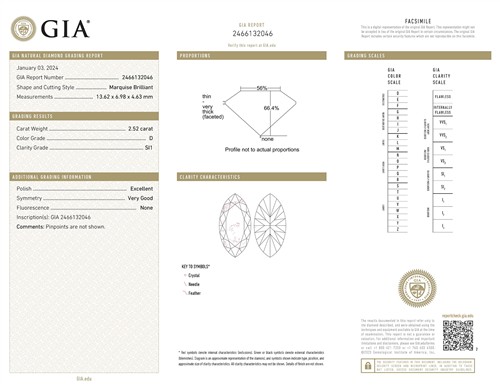 Accompanied by a facsimile GIA report (gia.edu/report-check-landing) numbered 2466132046 dated 3 January 2024, stating that the 2.52 carat diamond is natural, D colour, SI1 clarity;