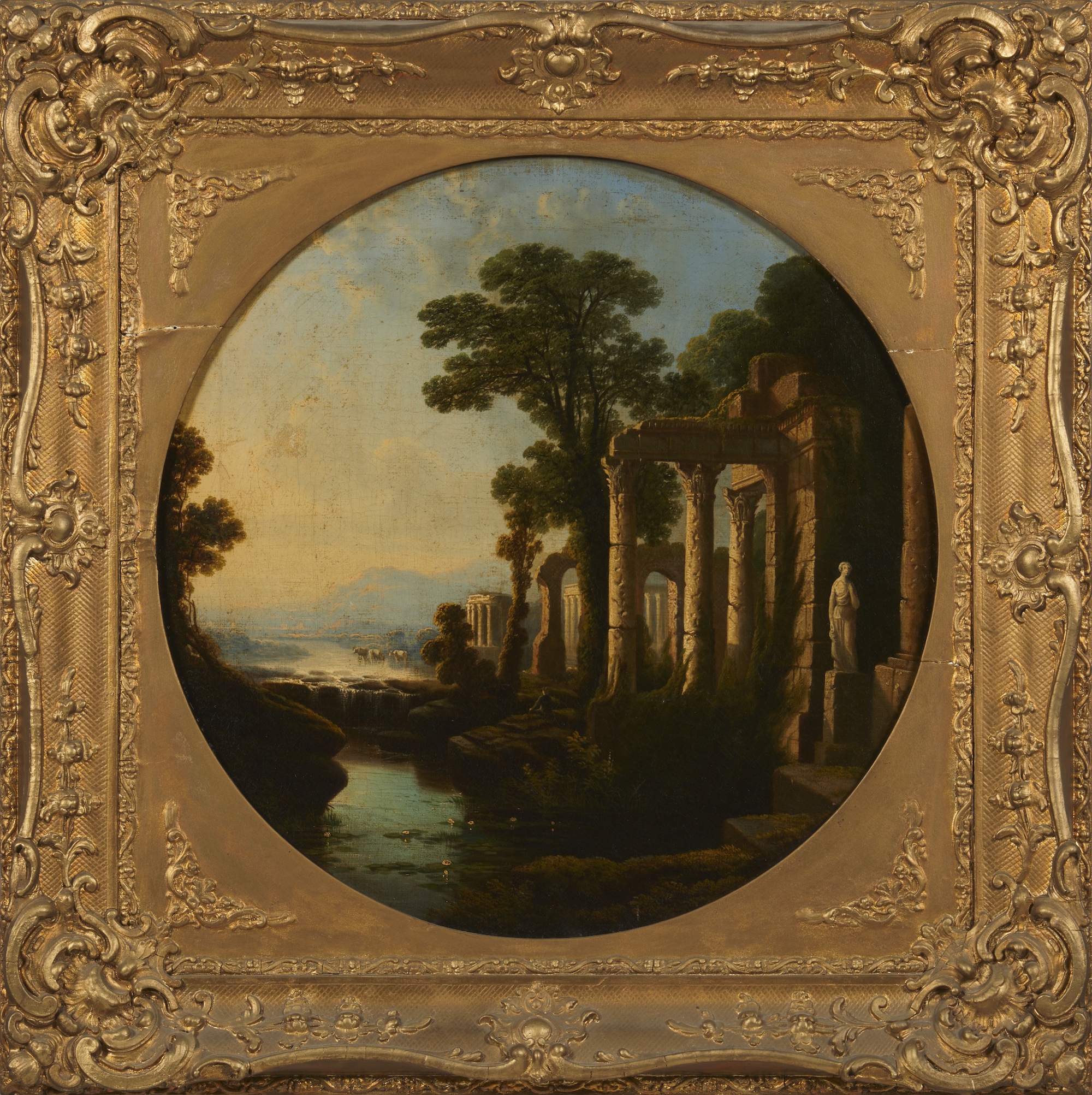 The antique frame, which might be original to the work, is in reasonably good condition, with some cracking and slight losses; it has been refinished in gold paint at some point.