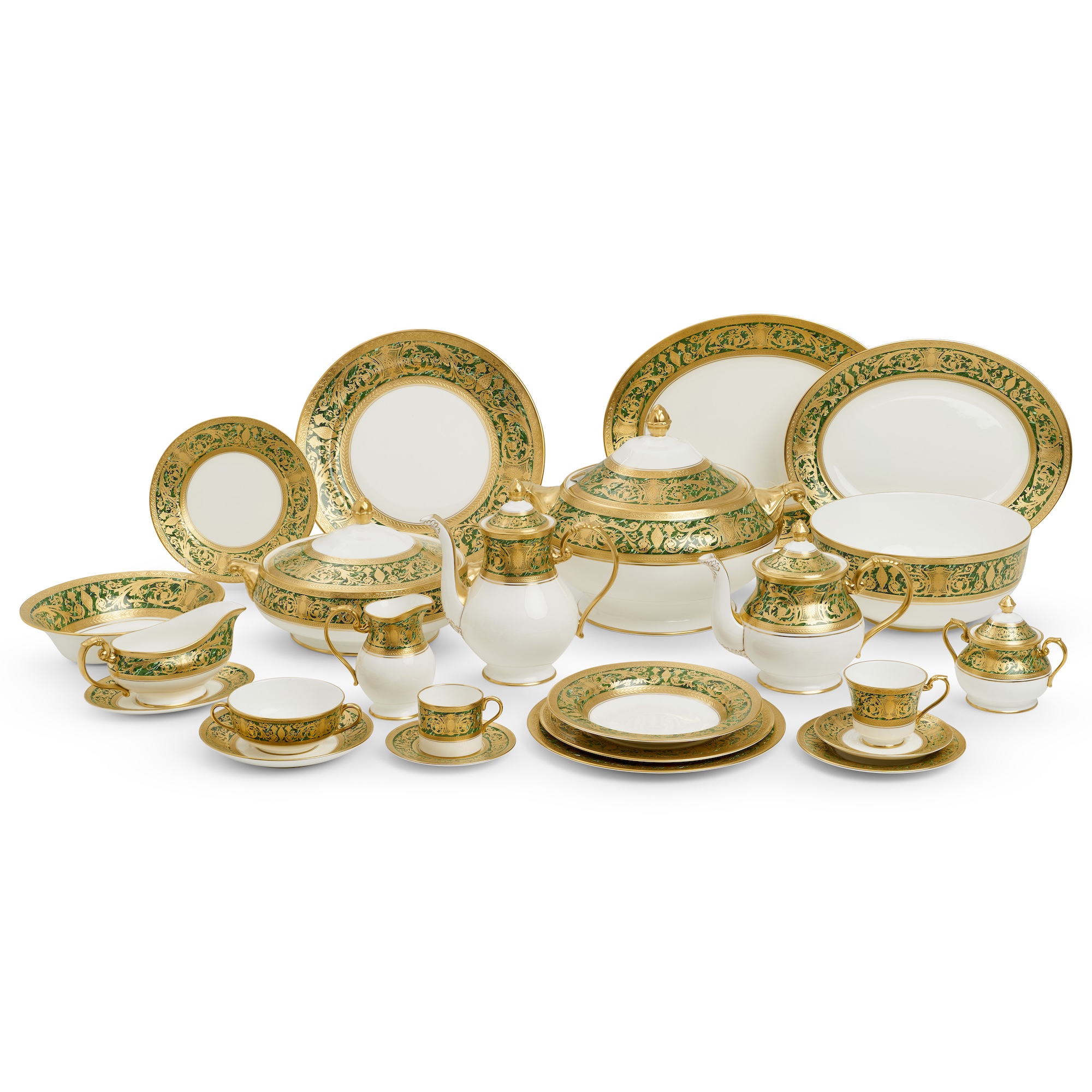In De Lamerie's 'Robert Adam' pattern with the Neo-Classical gilt decoration on marbled green borders, one hundred and forty-five pieces, comprising twelve each of soup plates, two-handled soup bowls and underplates, entrée / luncheon plates, dinner plates, side plates in two sizes, tea cups and saucers, and coffee cans and saucers, together with thirteen serving pieces including a tureen and covered and uncovered dishes, platters, tea and coffee pot, and associated pieces