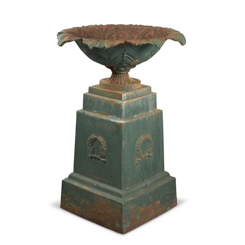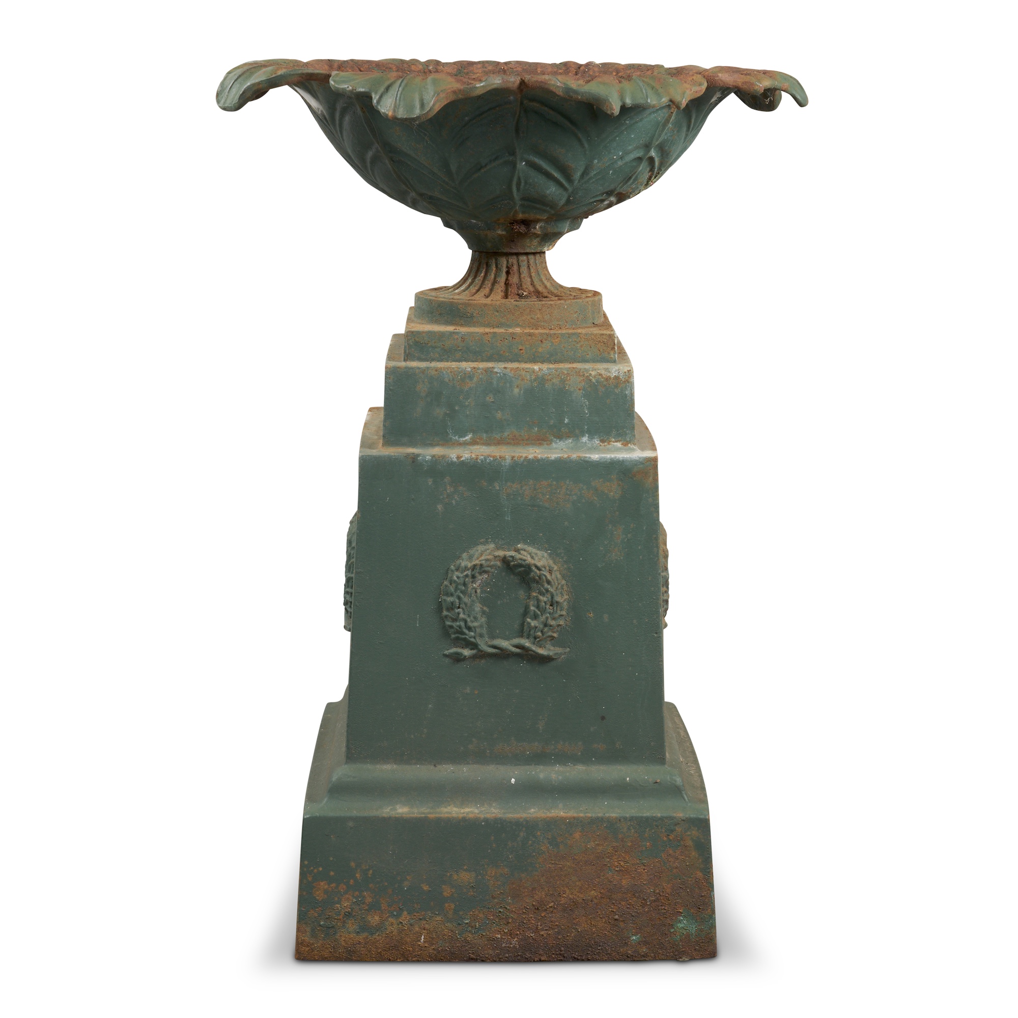 The broad open vase with sides modelled as leaves raised on an integral Classical stepped plinth with a laurel wreath in relief to each side, in old green paint
