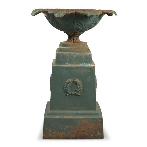 A VICTORIAN CAST IRON GARDEN VASE ON PEDESTAL