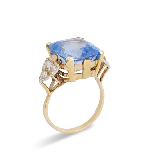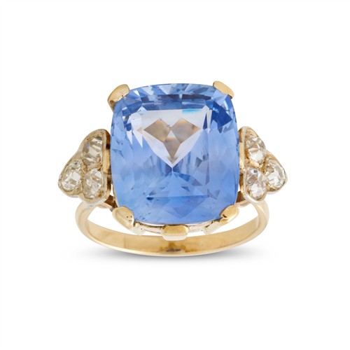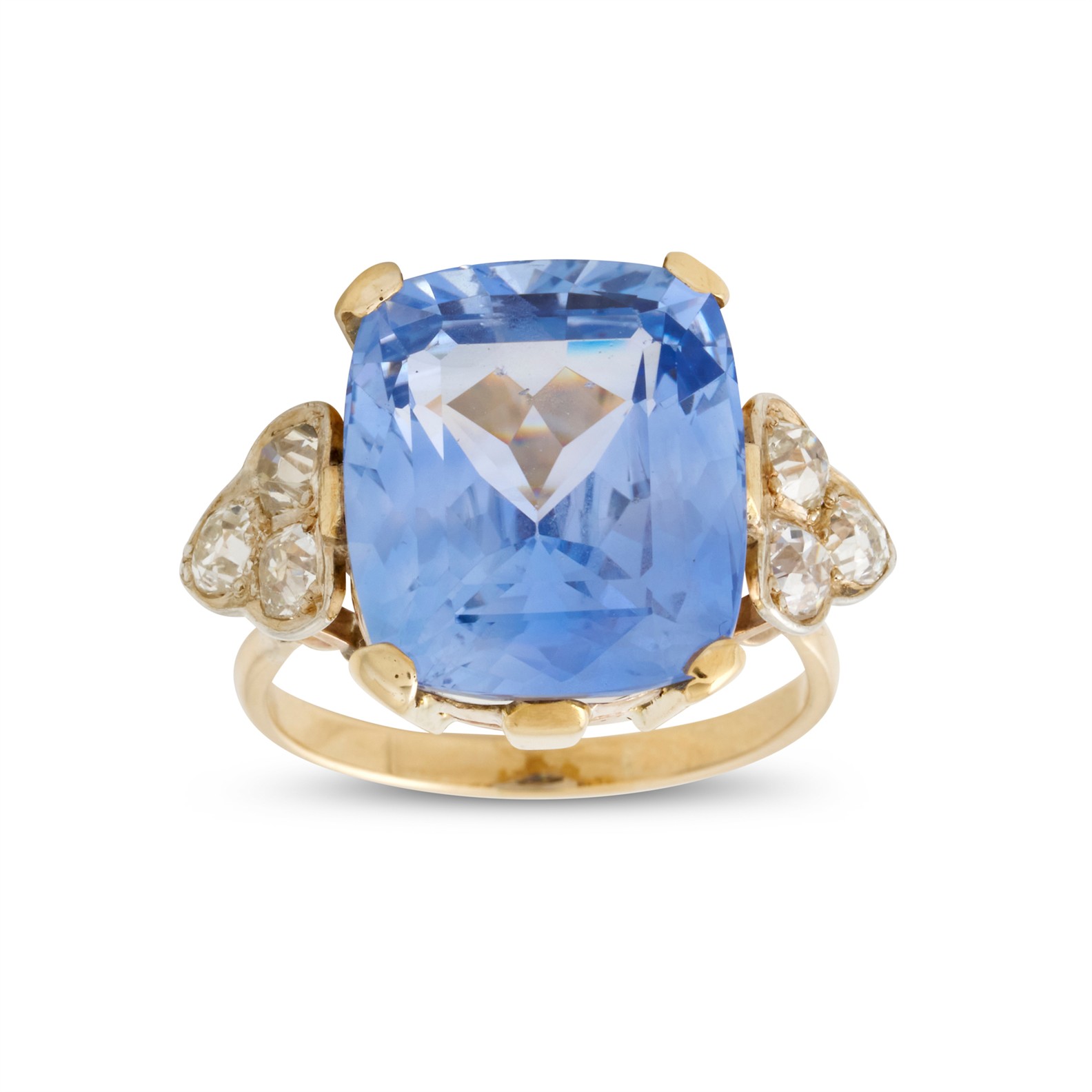 Centring a claw-set cushion-shaped sapphire weighing 23.34 carats, to shoulders similarly set with old European-cut diamonds, the diamonds together weighing approximately 0.72 carats, mounted in 14ct gold, size T1/2, gross weight approximately 10.3 grams.