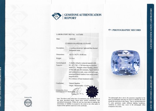 Accompanied by a GSL report numbered AA71690, dated 18 February 2026 stating that the 23.34 carat sapphire is natural, with no evidence of heat treatment,