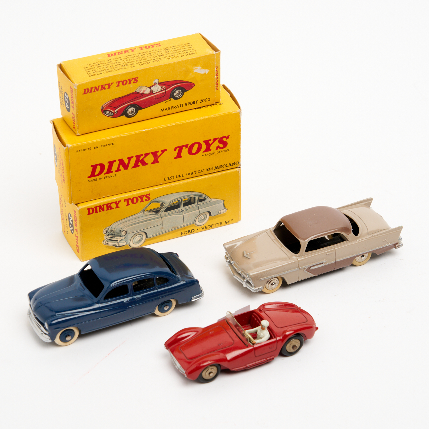 THREE FRENCH DINKYS INCLUDING A 22A MASERATI SPORT 2000, A 24D PLYMOUTH 'BELVEDERE' IN DEEP FAWN & BROWN, AND A 24X FORD VEDETTE 54 IN DEEP BLUE WITH ORIGINAL WHITE TYRES, ALL WITH BOXES L.10.5CM (LONGEST)