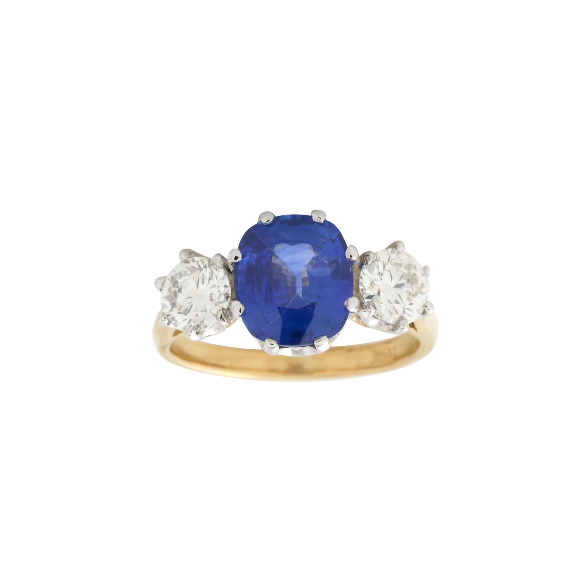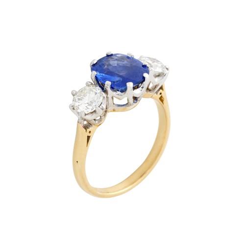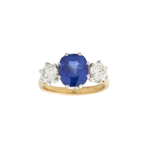 Centring a claw-set cushion shaped natural sapphire weighing approximately 2.48 carats, flanked by two claw-set round brilliant-cut diamonds, to raised shoulders and a rounded band, the diamonds together weighing approximately 1.06 carats, size L1/2, gross weight approximately 4.5 grams.