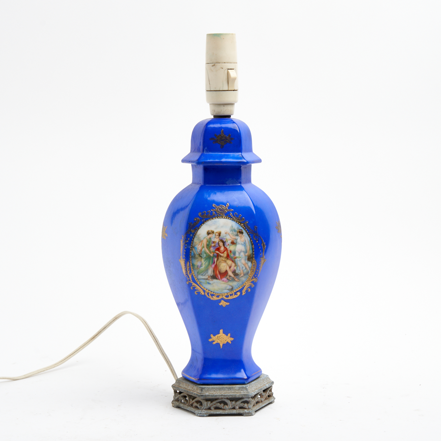 A 19TH CENTURY FRENCH LAMP WITH PAINTED REVEAL AND GILT FLORAL DECORATION H.42CM