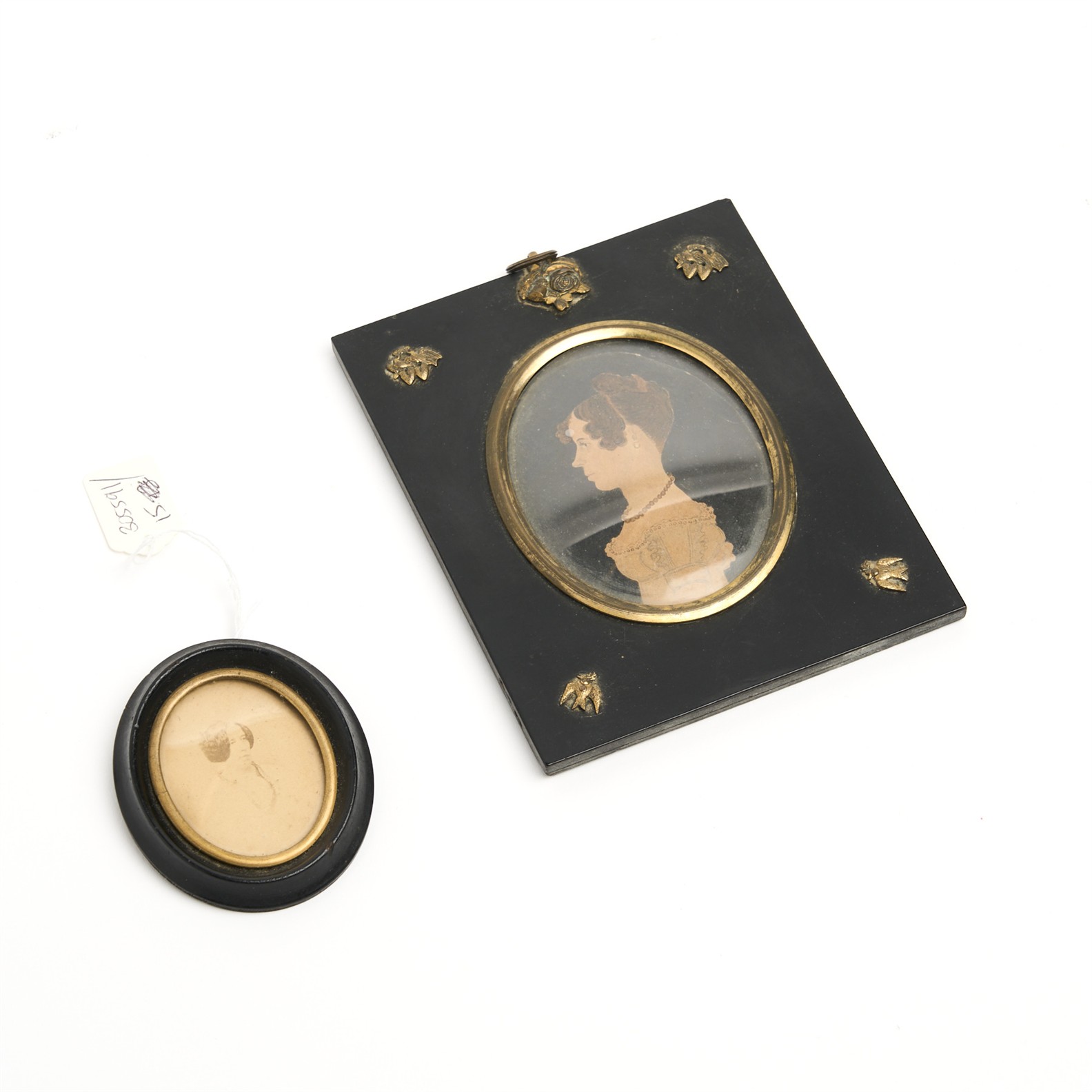 TWO EARLY VICTORIAN PORTRAIT MINIATURES, ONE IN WATERCOLOUR OF A LADY IN PROFILE IN SILHOUETTE MANNER, THE OTHER AN EARLY PHOTOGRAPHIC PORTRAIT OF A LADY H.14CM (TALLEST)