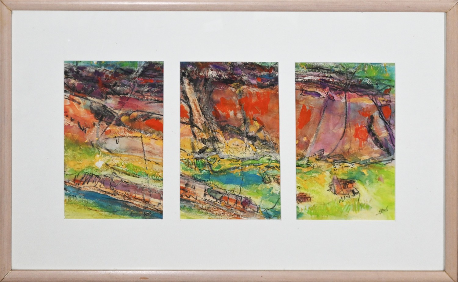 MIXED MEDIA TRIPTYCH, SIGNED LOWER LEFT (EACH), TITLE AND ARTIST NAME INSCRIBED VERSO, 16 X 26.5CM (EACH), FRAME SIZE: 74 X 46CM