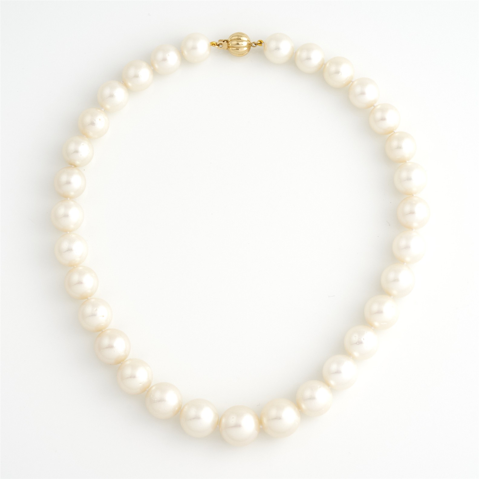 A GRADUATED STRAND OF SOUTH SEA PEARLS, THE PEARLS MEASURING 12MM - 16MM, TO A CLASP IN 9CT GOLD, TOTAL LENGTH 400MM