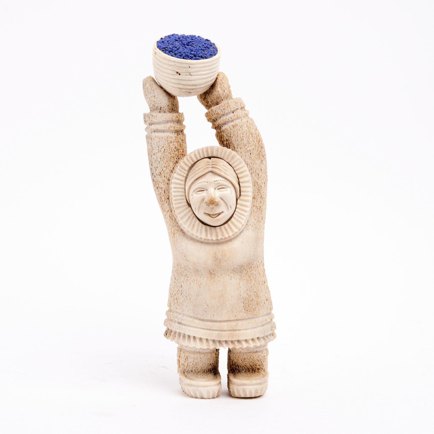 A KENT HEINDEL WHALEBONE AND BEAD SCULPTURE OF AN INUIT WOMAN, SIGNED H.28CM