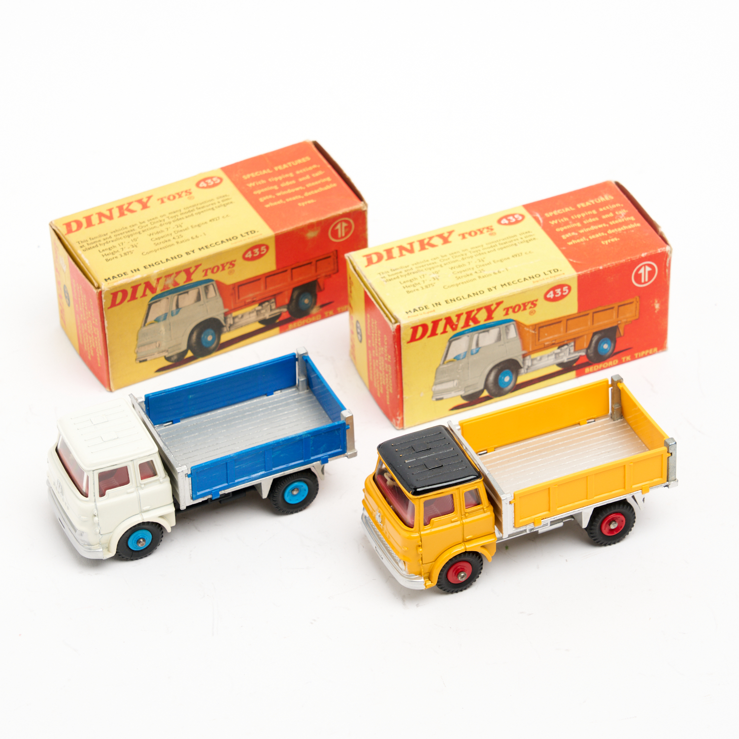 TWO DINKY 435 BEDFORD T.K TIPPERS, INCLUDES WHITE AND BLUE AND YELLOW WITH BLACK ROOF, BOTH WITH BOXES