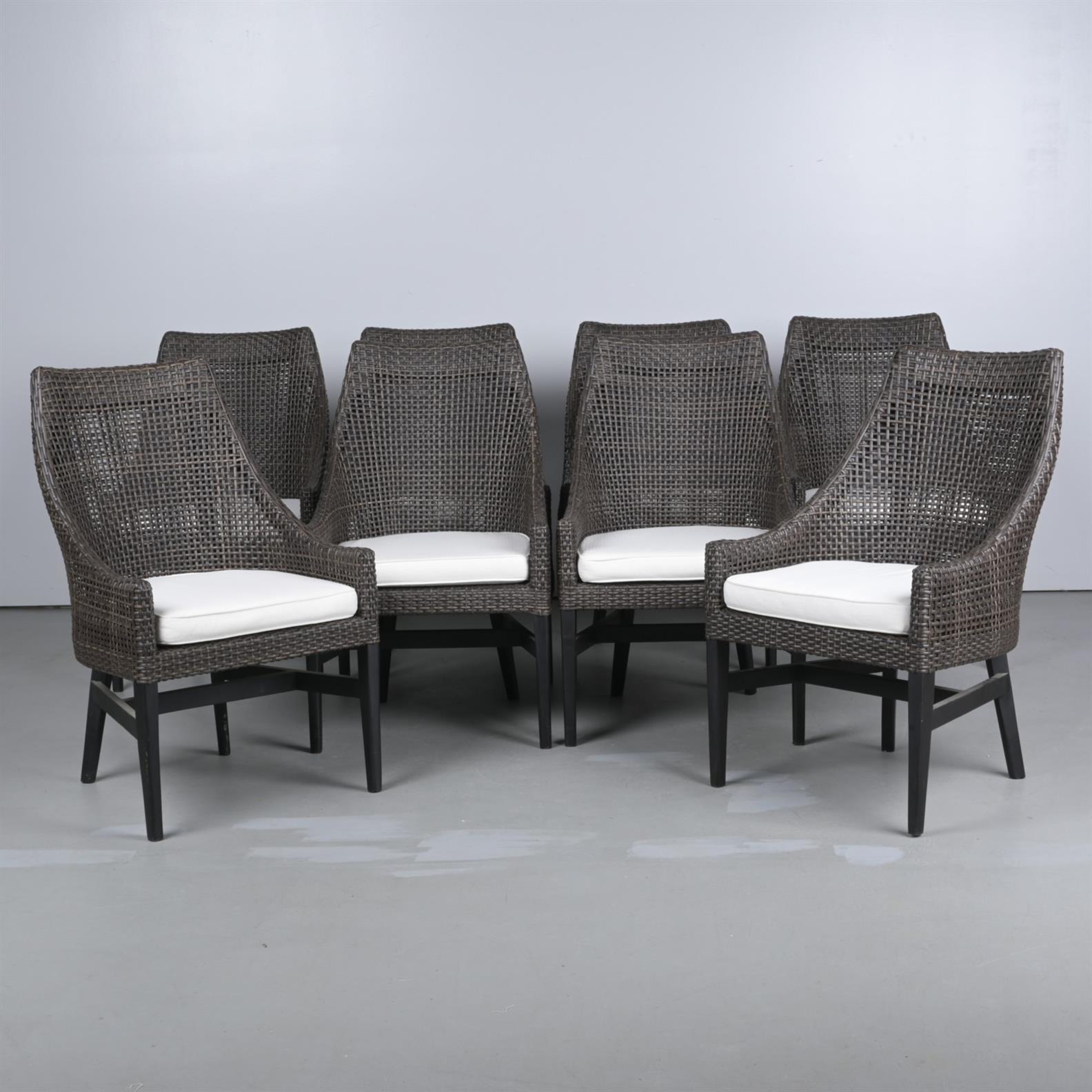 A SET OF EIGHT HARDWOOD AND WOVEN ACRYLIC OUTDOOR CHAIRS WITH LOOSE CUSHIONS (96H X 60W X 70D CM)