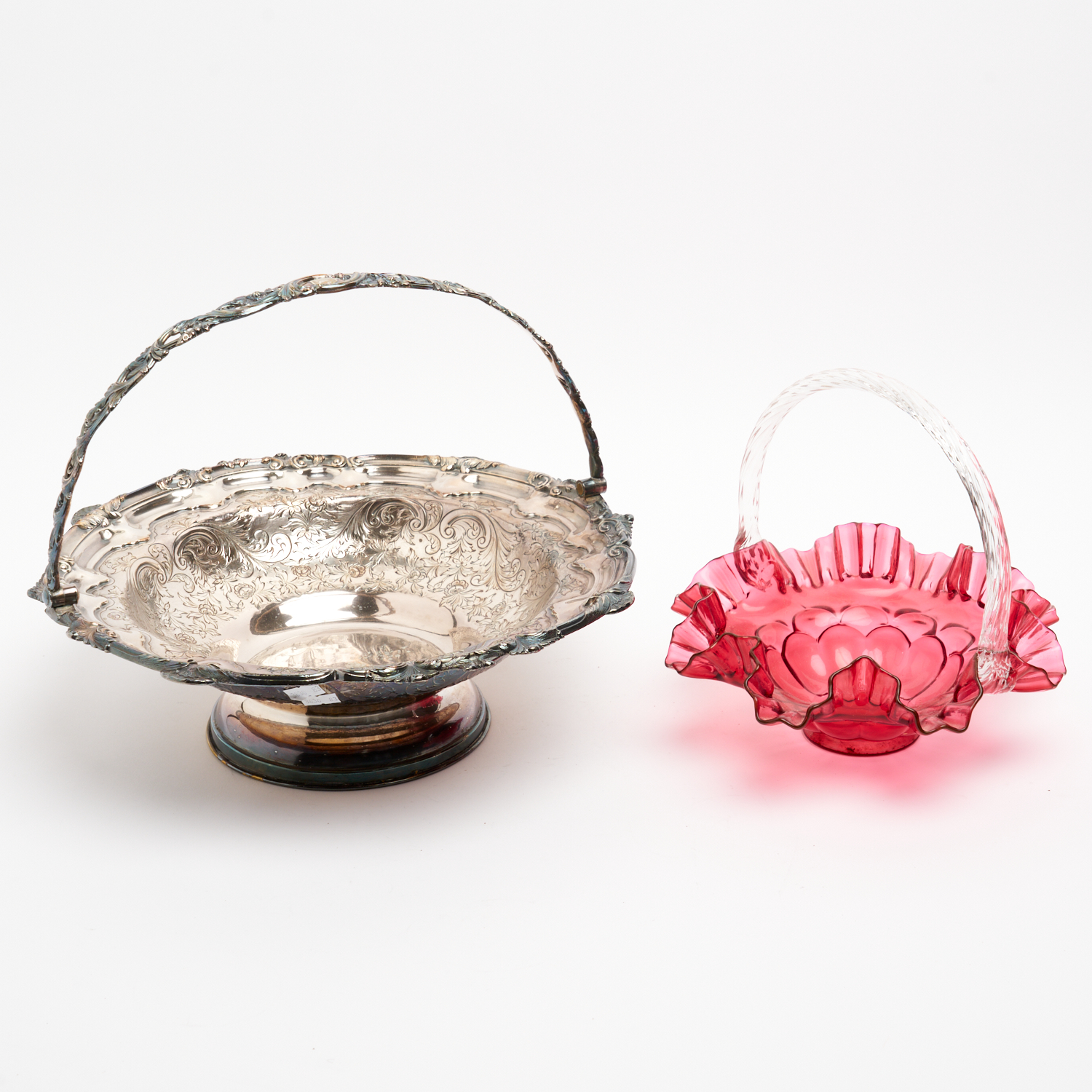 TWO BASKETS, ONE A FENTON CRANBERRY GLASS BASKET, THE OTHER A SILVER PLATE SWING HANDLED BASKET DIA.36CM (LARGEST)