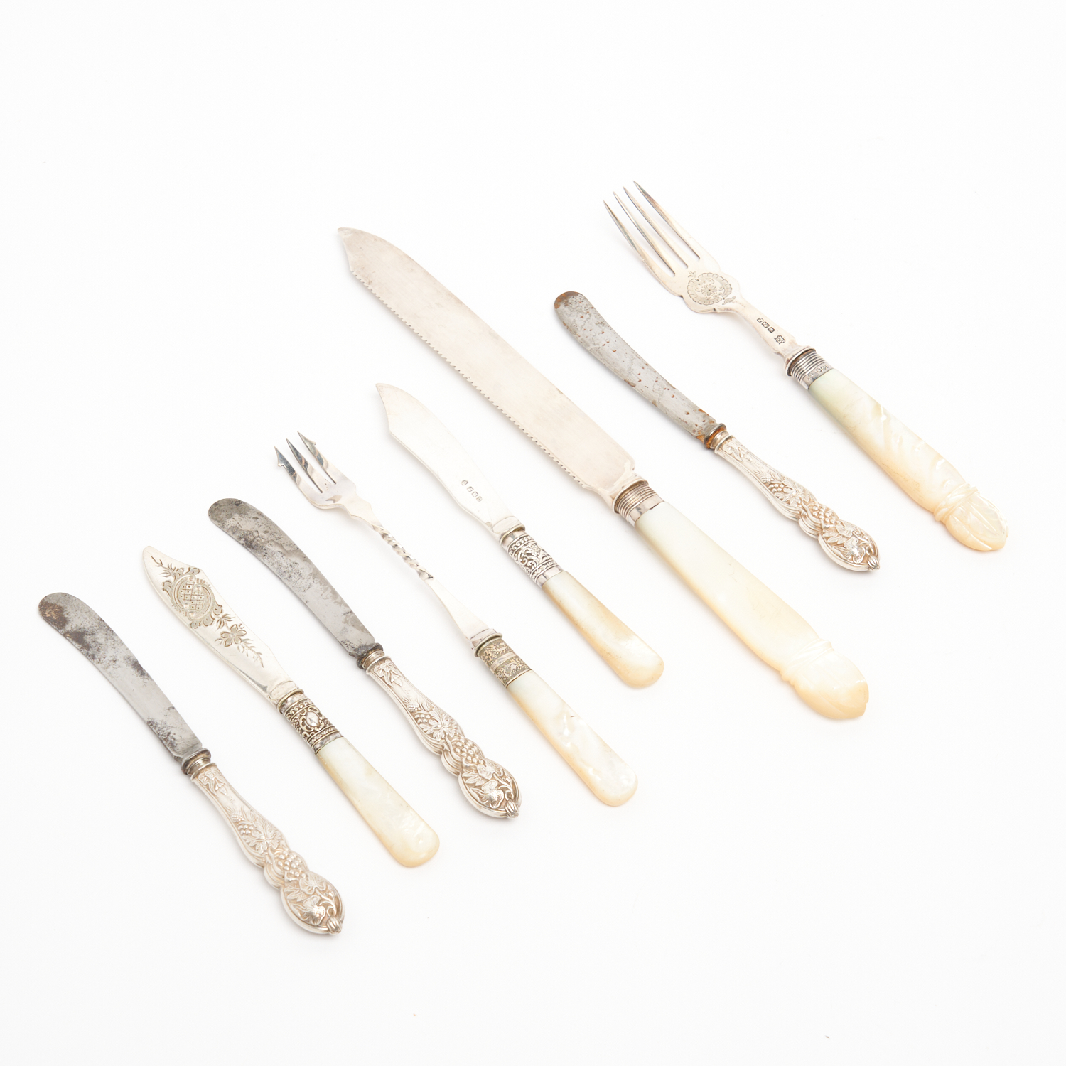 A GROUP OF VICTORIAN STERLING SILVER FLATWARE INCLUDING MOTHER OF PEARL HANDLED BREAD KNIFE WITH STERLING BLADE L.28CM (LARGEST)