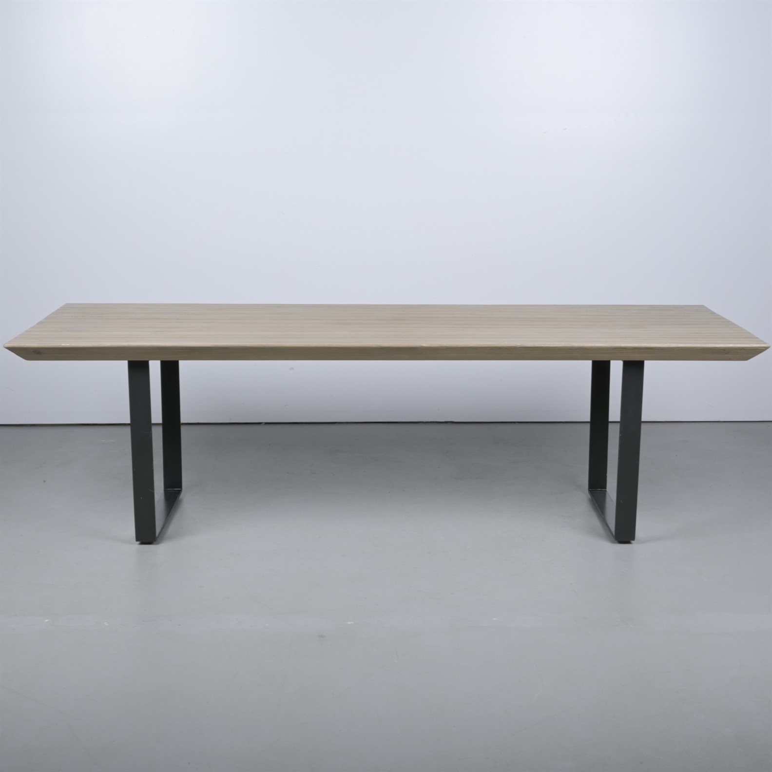 A CONTEMPORARY HARDWOOD AND METAL DINING TABLE BY GLOBEWEST (77CMH X 260CM W X 100CM D)(THIS ITEM MUST BE REMOVED BY THE CUSTOMER OR CARRIERS AT THE CUSTOMER'S EXPENSE. LEONARD JOEL
