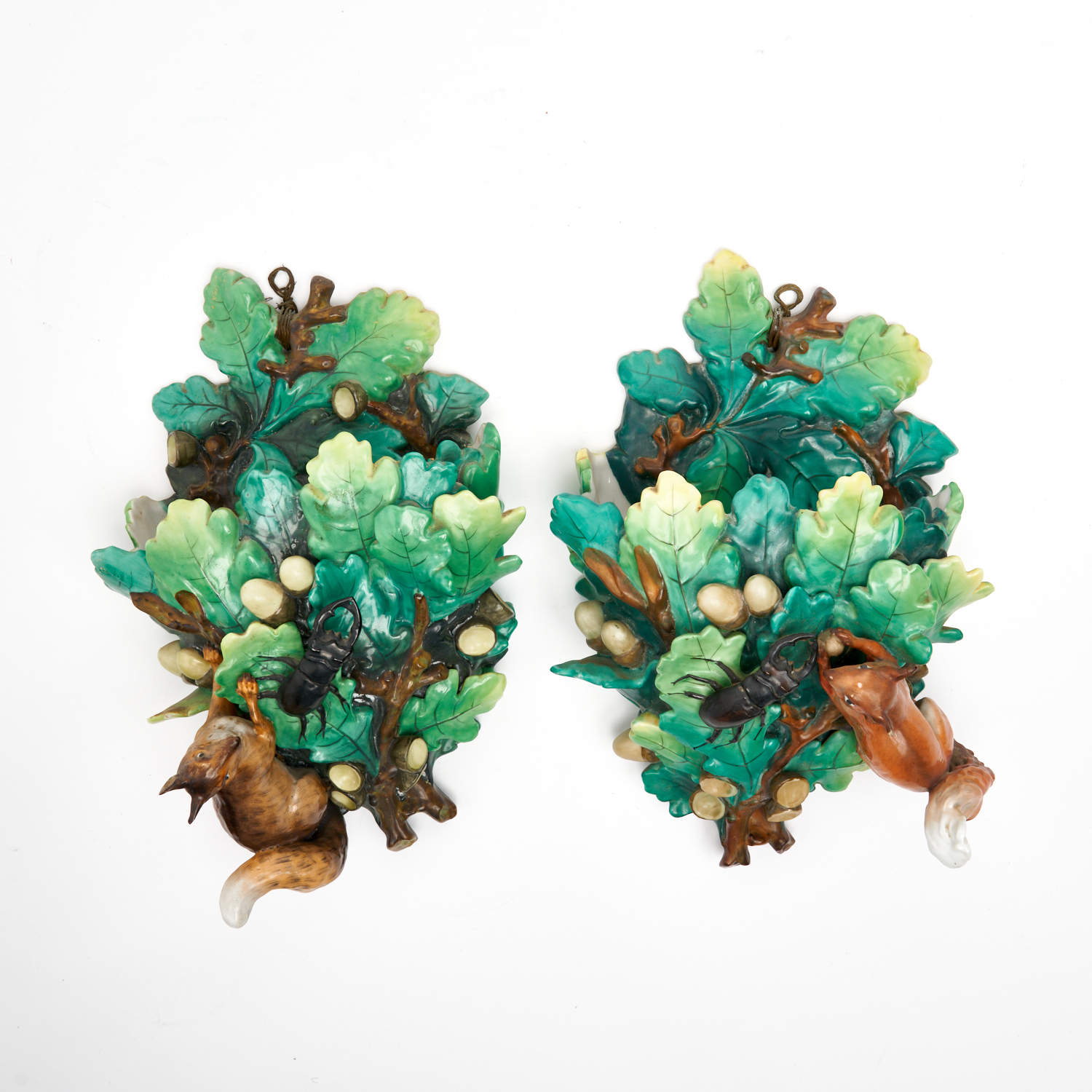 A PAIR OF PORCELAIN WALL POCKETS MODELLED WITH BEETLES AND SQUIRRELS ON LEAVED BRANCHES H.27CM