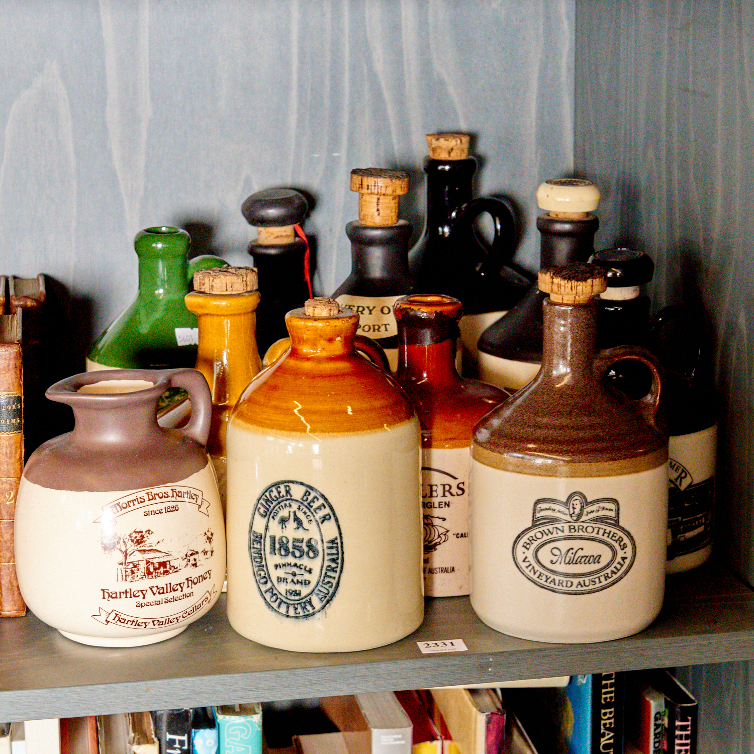 A LARGE COLLECTION OF STONEWARE JUGS INCLUDING BENDIGO POTTERY, STONES GINGER WINE, AND BROWN BROTHERS H.24CM (TALLEST)