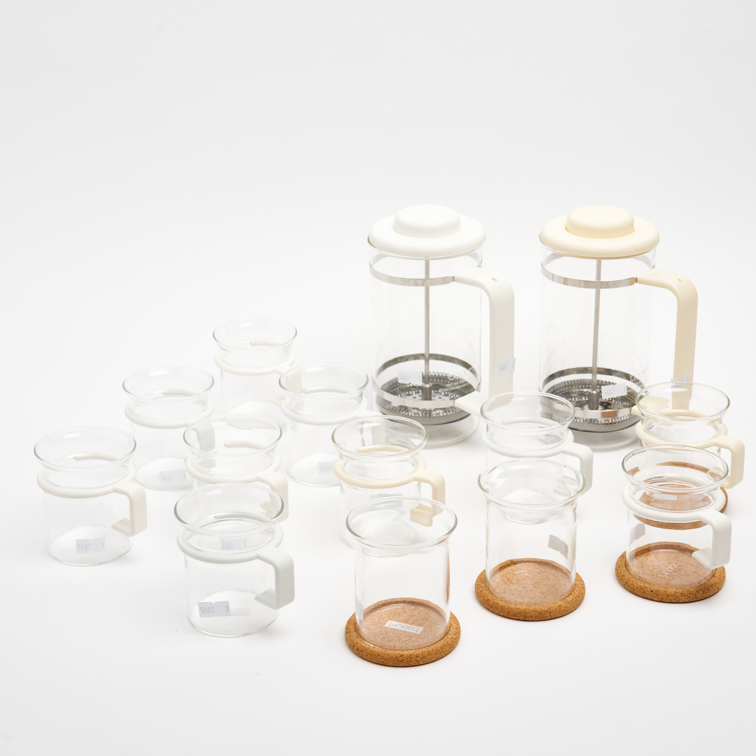 A BODUM COFFEE SET, INCLUDING PLUNGERS (2), COFFEE CUPS (8), PITCHERS (2), COASTERS (4) H.20CM