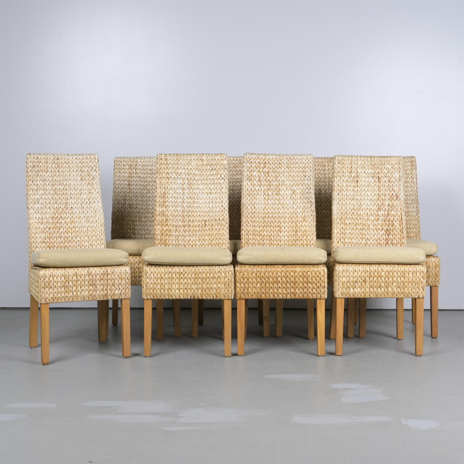 A SET OF EIGHT WOVEN RUSH DINING CHAIRS WITH LOOSE SEAT CUSHIONS (105H X 50W X 53D CM)