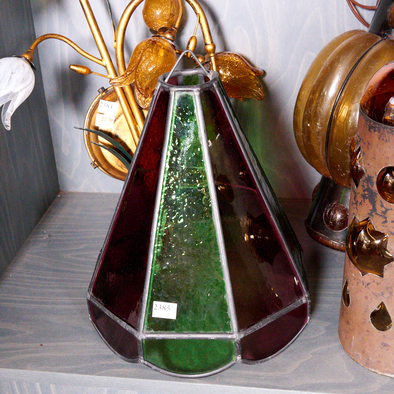 A LEADLIGHT LAMPSHADE IN GREEN AND PURPLE H.35CM