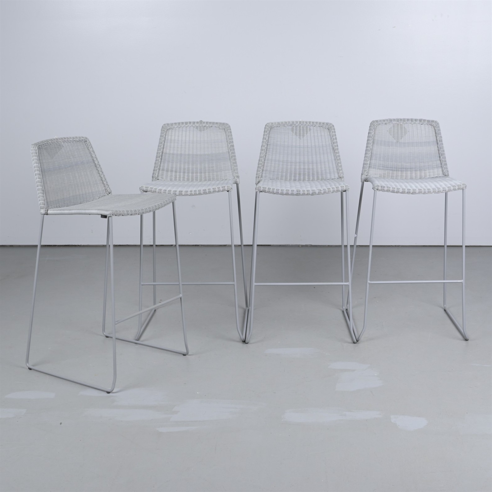 A SET OF FOUR METAL AND WOVEN ACRYLIC STOOLS BY CANELINE (101H X 45W X 60D CM)