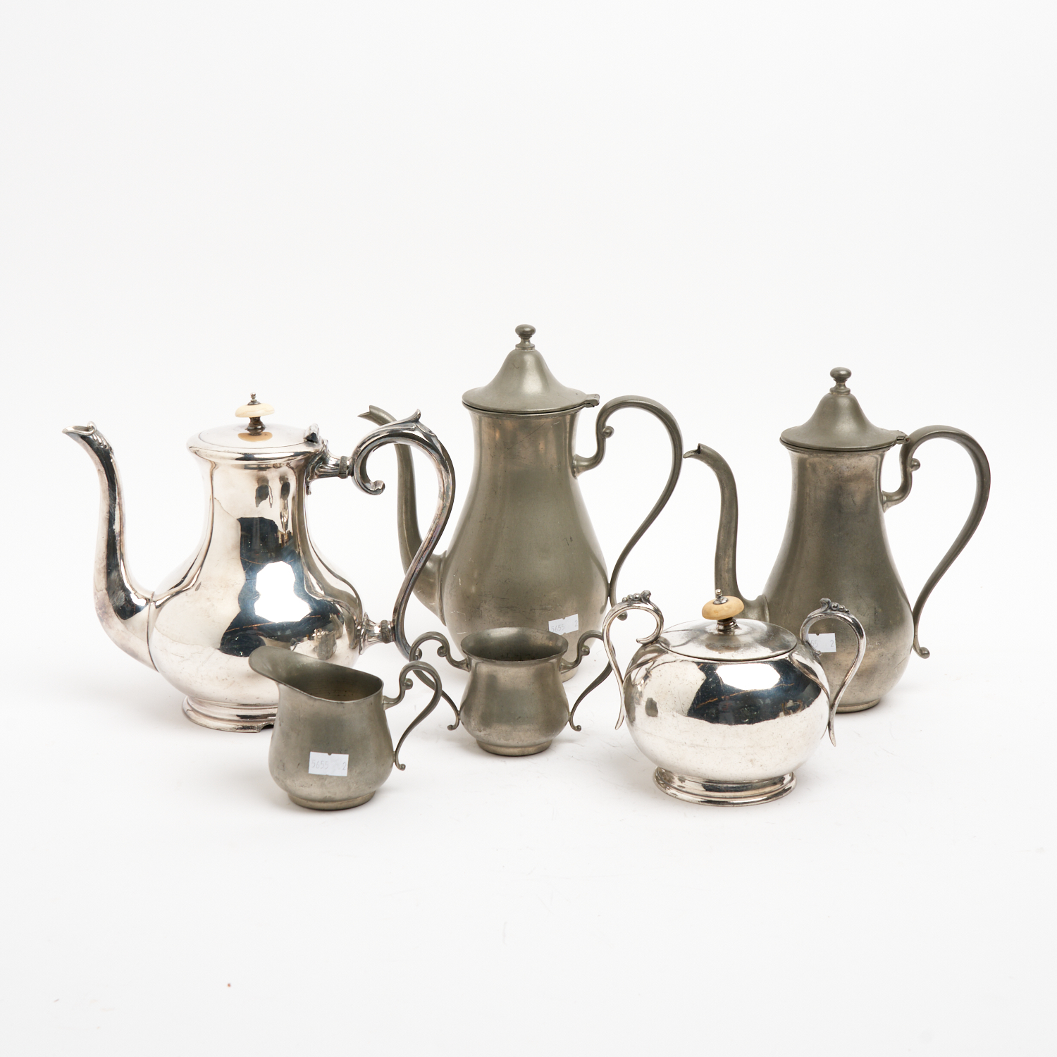 A COLLECTION OF PEWTER AND PLATED COFFEE POTS H.26CM
