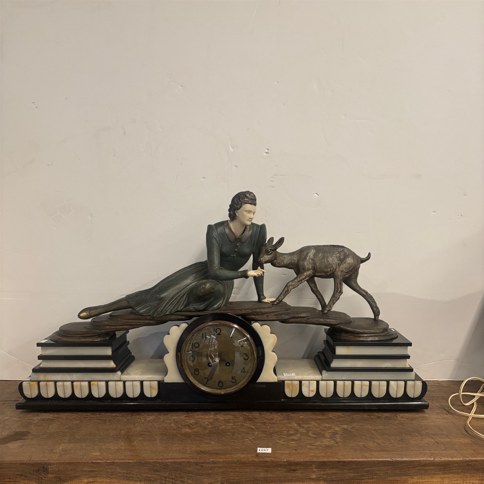 AN ART DECO COLD PAINTED SPELTER CLOCK WITH FIGURE AND DEER, SIGNED MENNEVELLE, C.1930S A/F L.80CM
