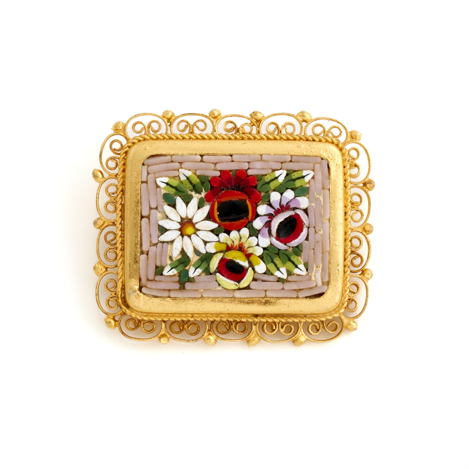 A MOSAIC BROOCH IN GOLD PLATE, 40MM X 35MM, 13.1GMS