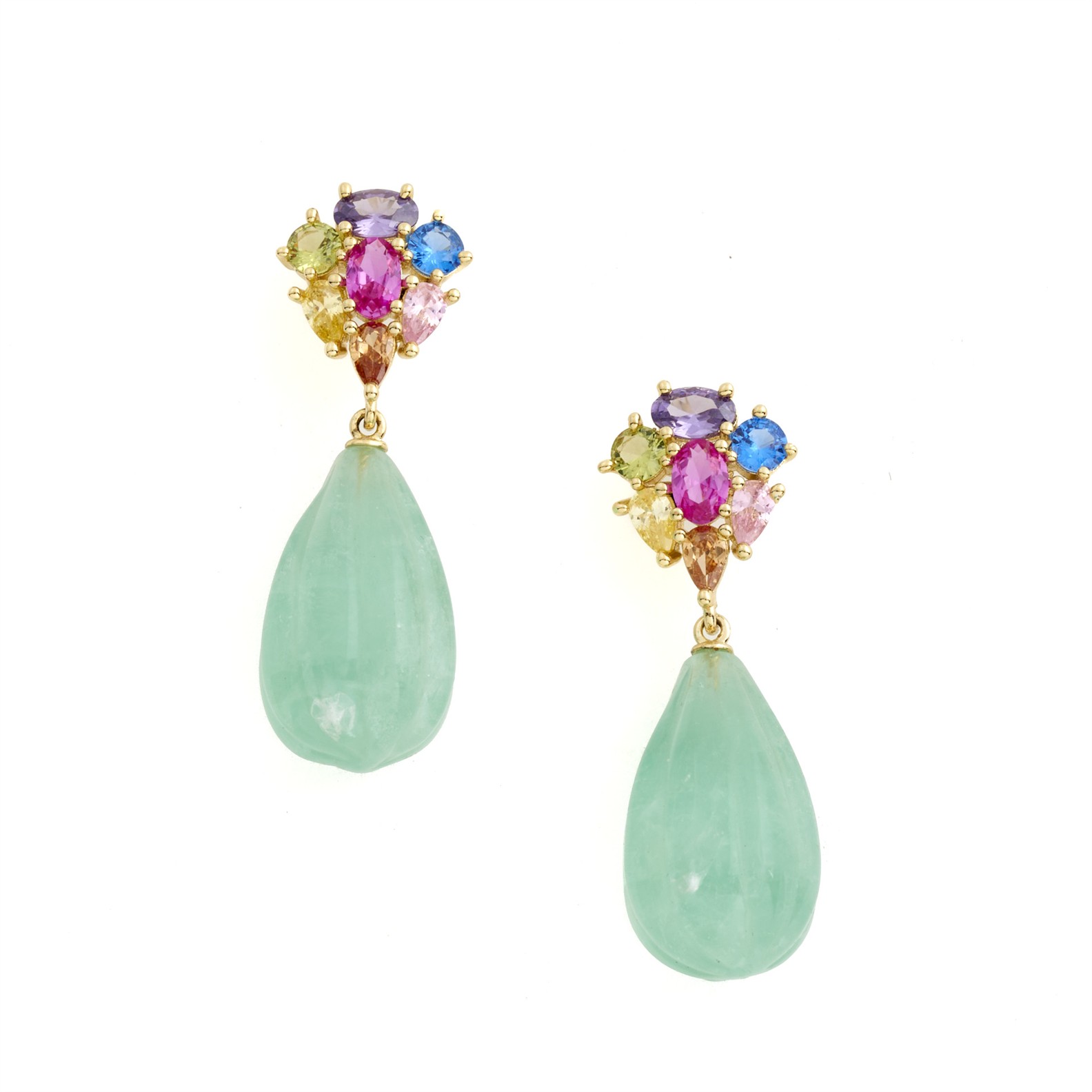A PAIR OF CARVED GEM SET FLUORITE DROP EARRINGS IN SILVER GILT, DROP LENGTH 41MM, TO POST AND BUTTERFLY FITTINGS