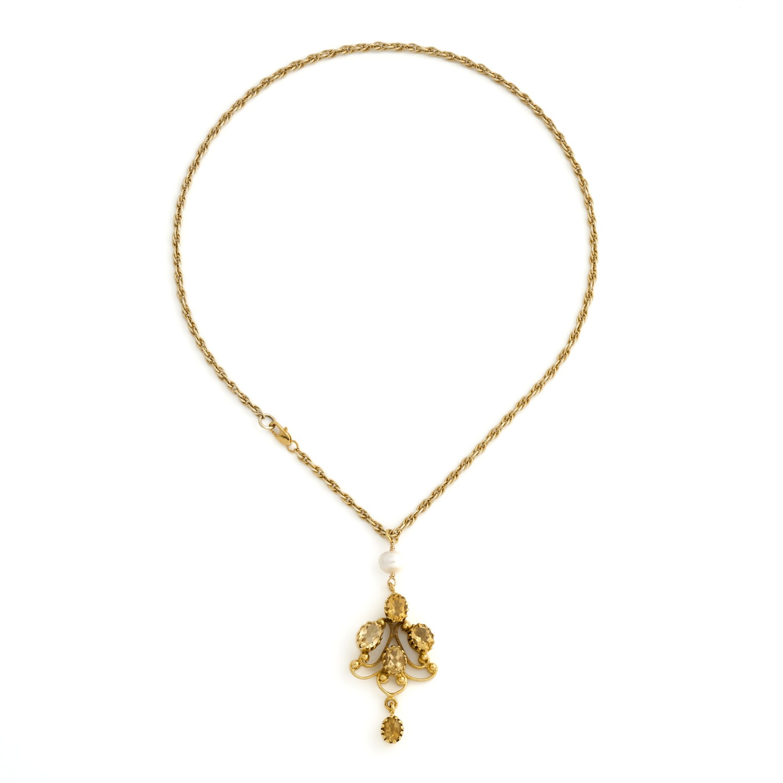 A VINTAGE CITRINE PEARL AND CITRINE PENDANT TO A CHAIN IN SILVER GILT, LENGTH 420MM