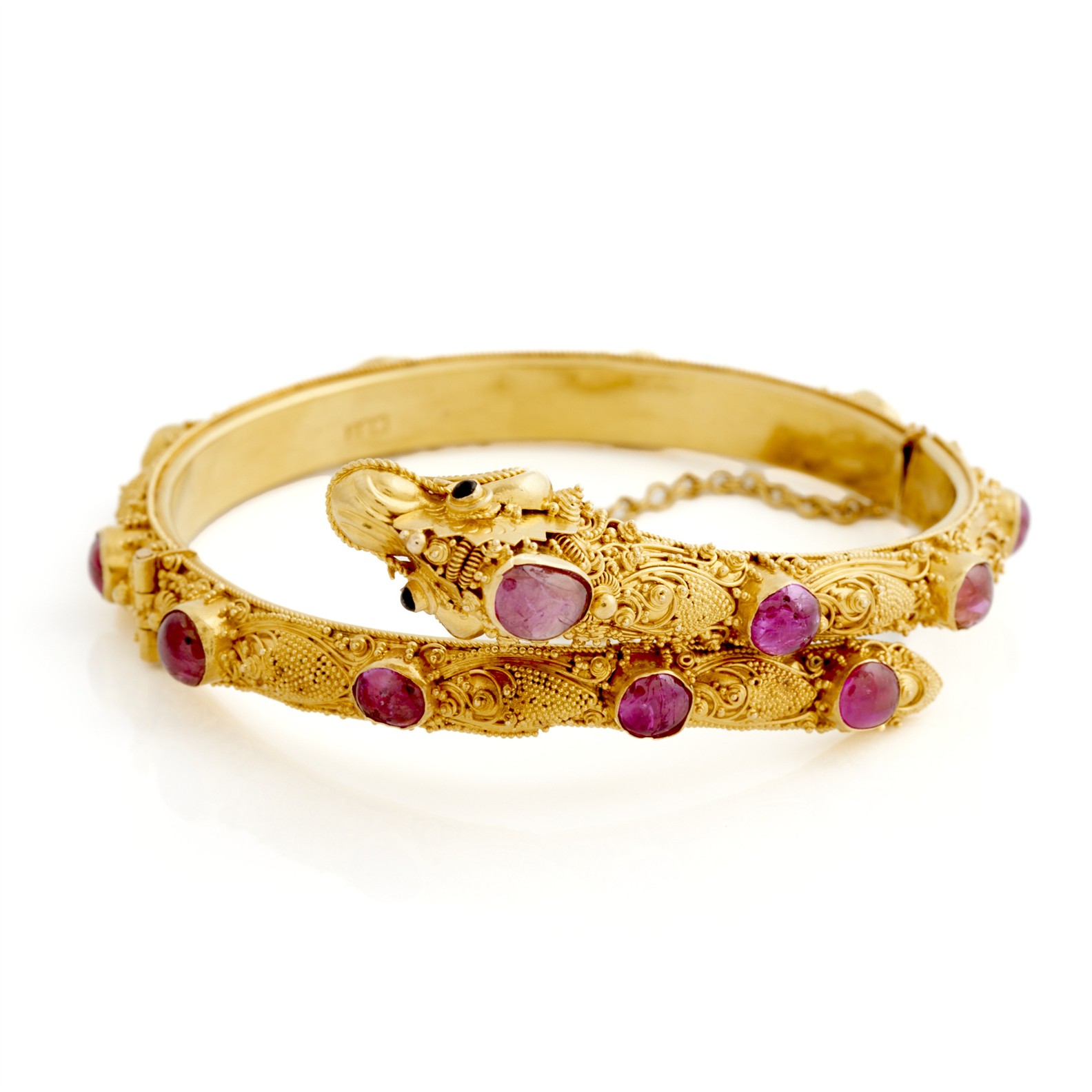 A RUBY SET SNAKE HINGED BANGLE IN 18CT GOLD, INNER DIAMETER 55MM, 20.08GMS