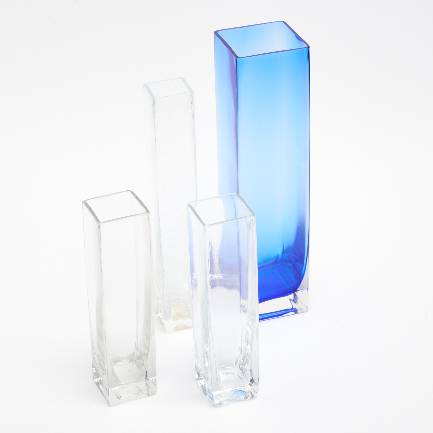 FOUR CONTEMPORARY SQUARE ART GLASS VASES INCLUDING BAYEL H.30CM