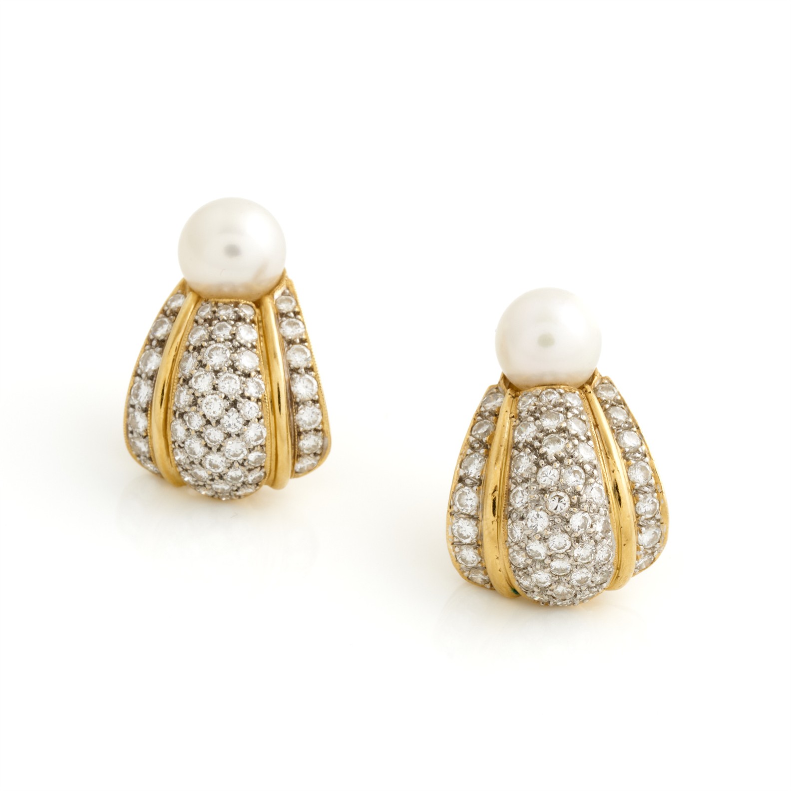 A PAIR OF PEARL AND DIAMOND EARRINGS IN 18CT GOLD, LENGTH 25MM, TOTAL WEIGHT 8.8GMS, TO POST AND BUTTERFLY FITTINGS