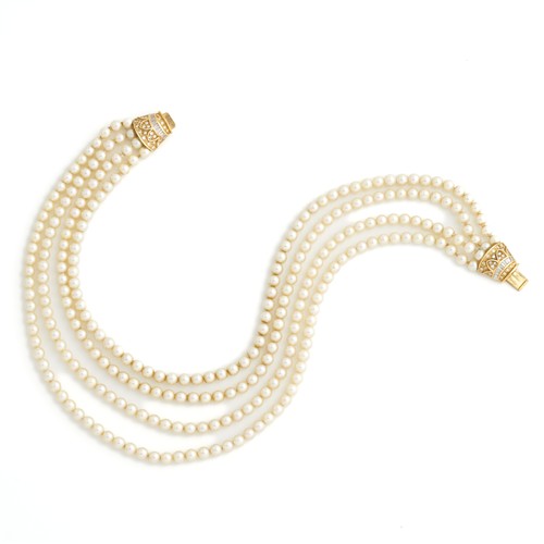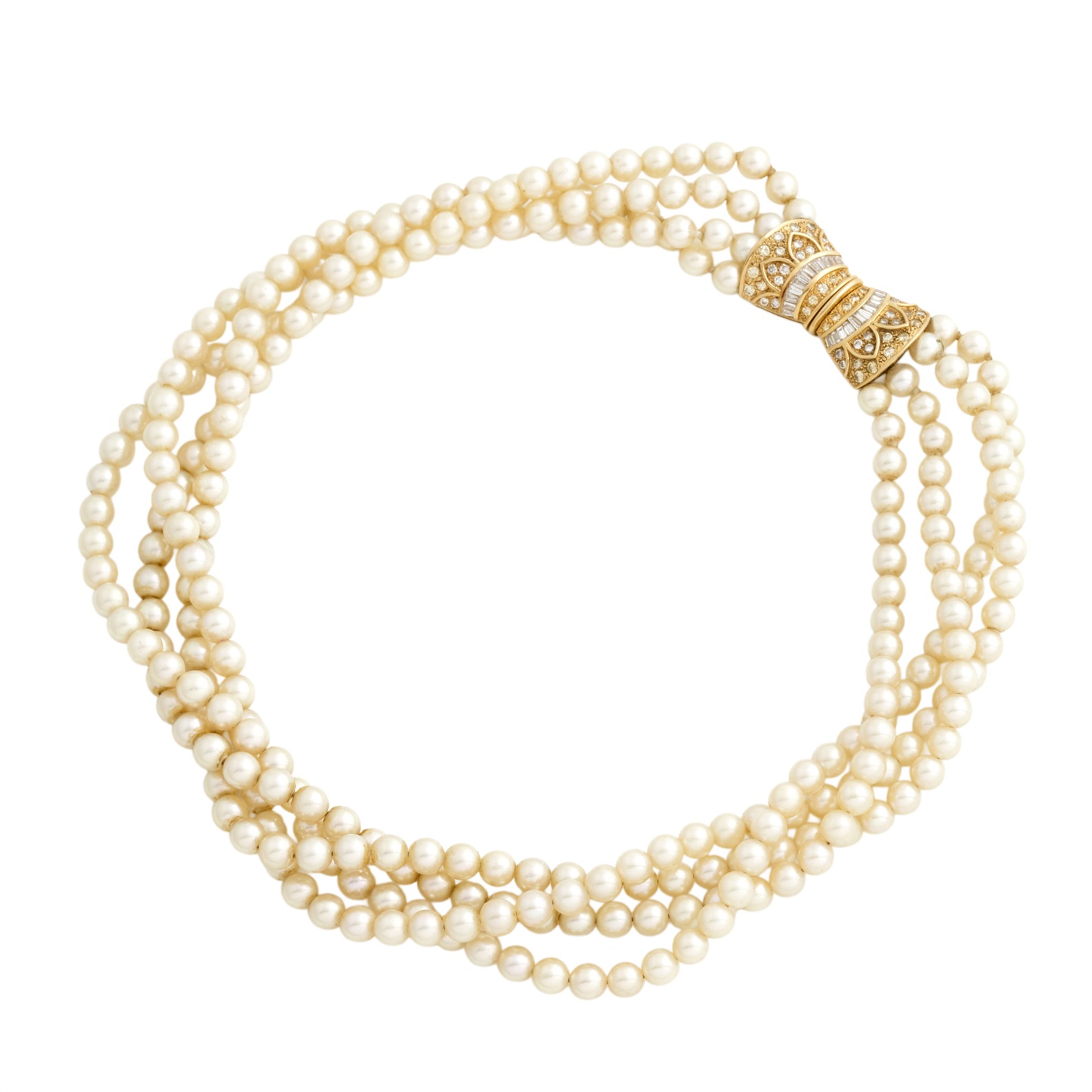 A MULTISTRAND CULTURED PEARL NECKLACE TO A DIAMOND SET CLASP IN 18CT GOLD, LENGTH 300MM