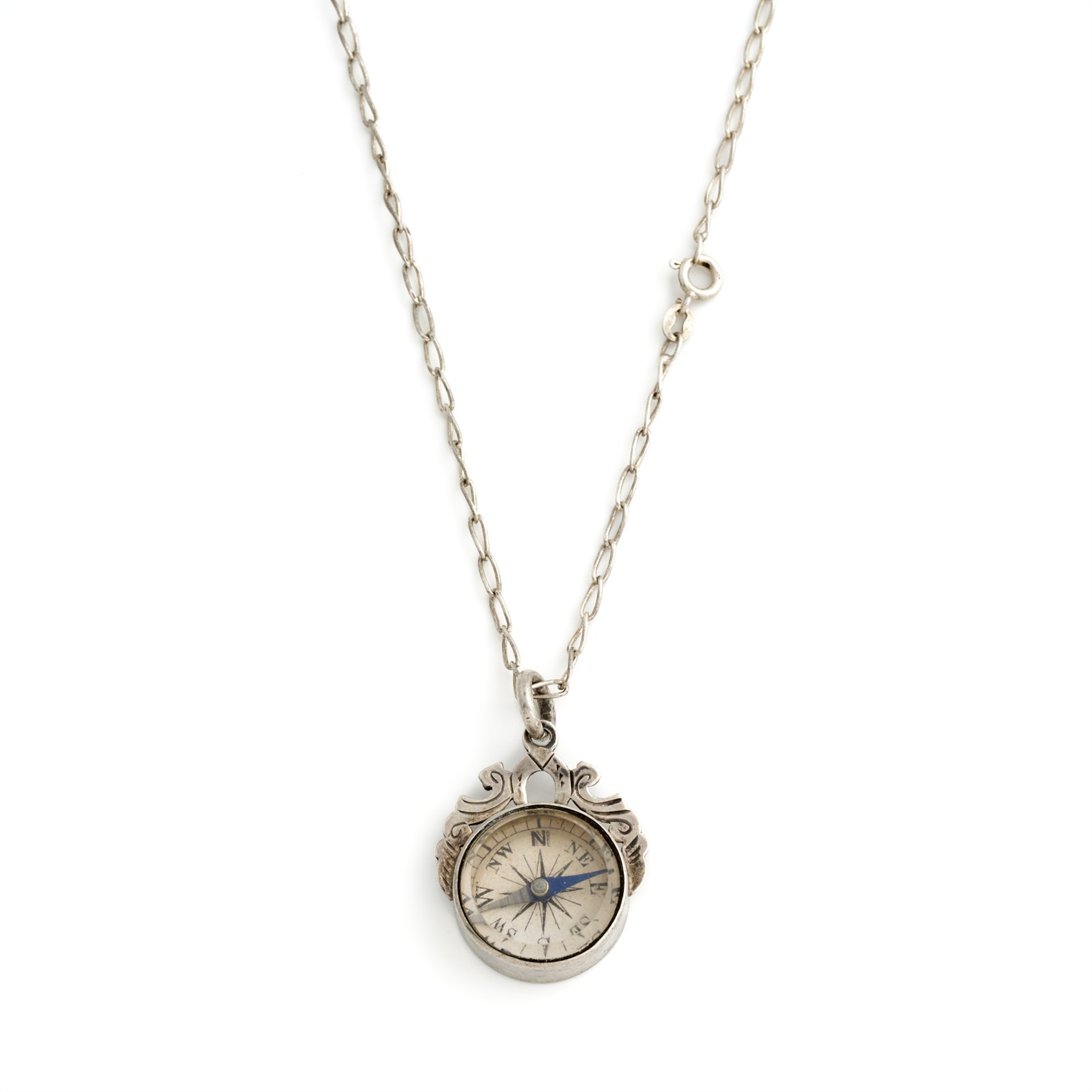 AN ANTIQUE COMPASS PENDANT IN STERLING SILVER, TO A CHAIN IN SILVER, LENGTH 520MM