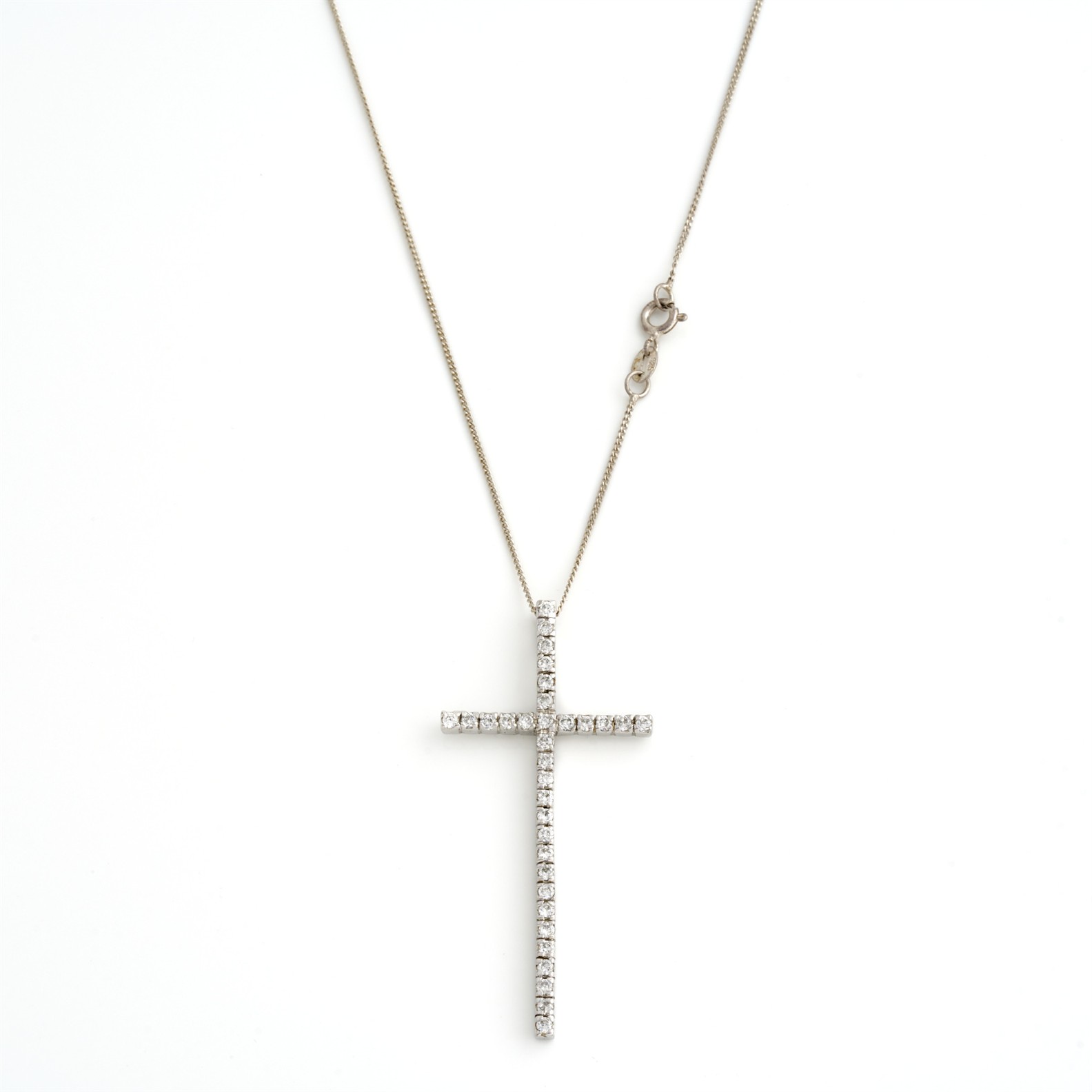 A CUBIC ZIRCONIA CROSS PENDANT IN SILVER, LENGTH 480MM