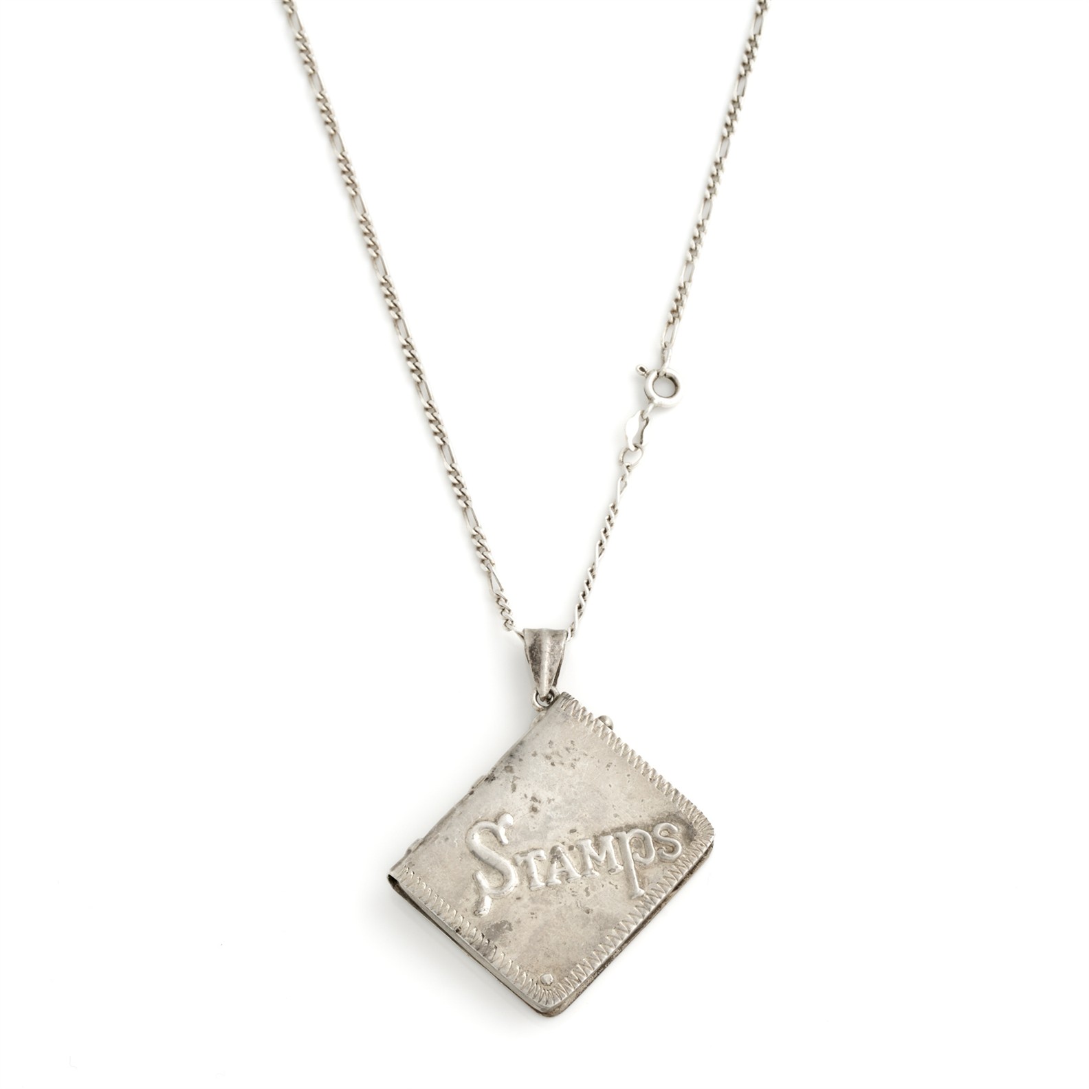 A STAMP BOOK PENDANT IN STERLING SILVER, 50MM, TO A FIGARO LINK CHAIN IN STERLING SILVER, 380MM, TOTAL WEIGHT 17.31GMS
