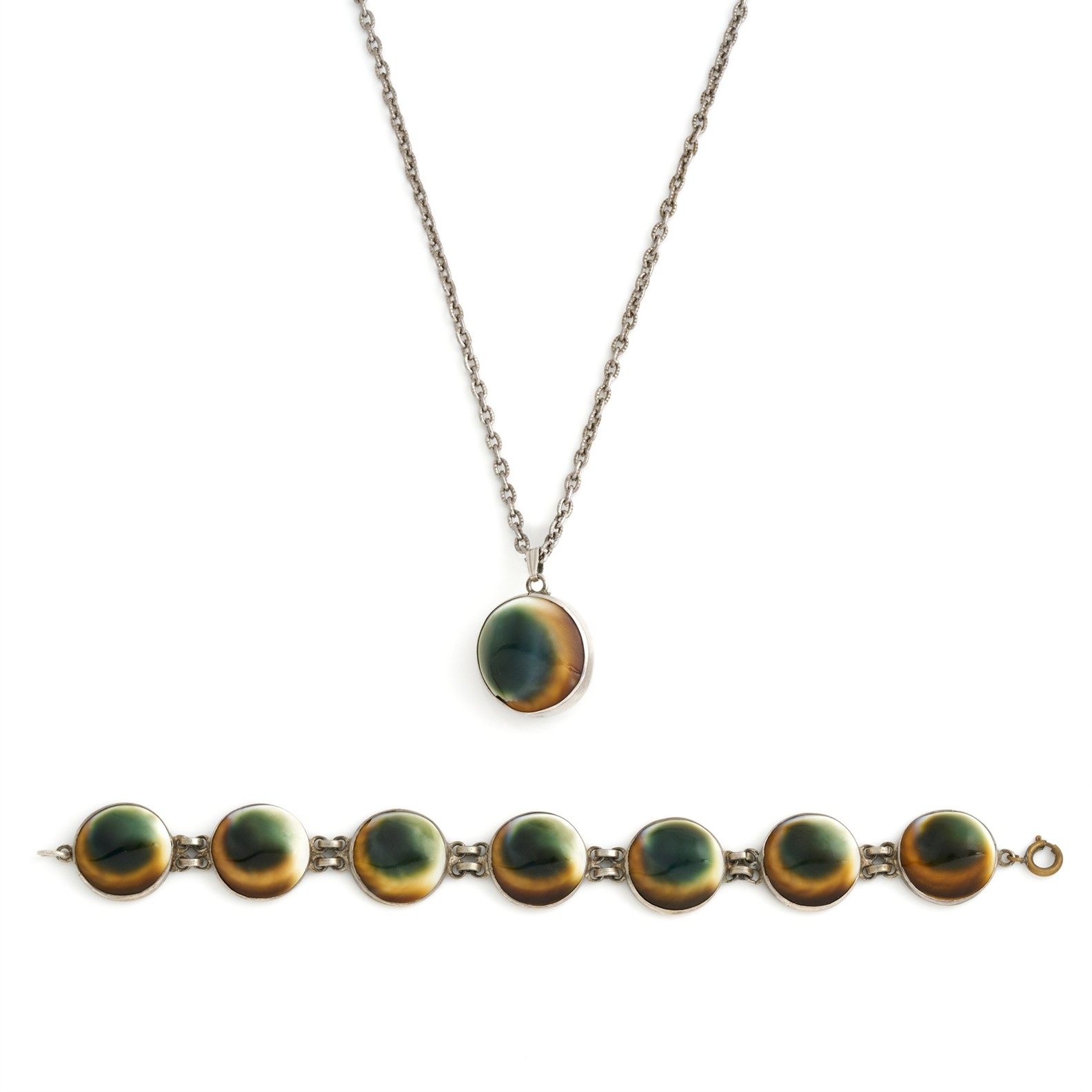 AN OPERCULUM SET SUITE IN STERLING SILVER, COMPRISING OF A PENDANT TO CHAIN AND BRACELET, CHAIN LENGTH 460MM, BRACELET LENGTH 170MM