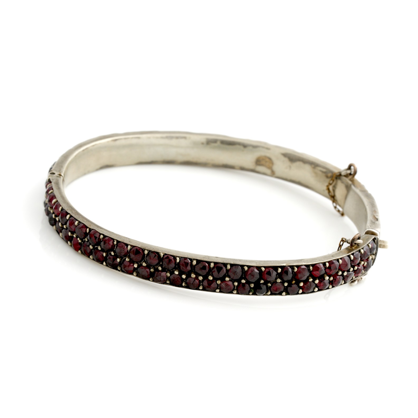 A BOHEMIAN GARNET BANGLE IN SILVER, INNER DIAMETER APPROXIMATELY 60MM