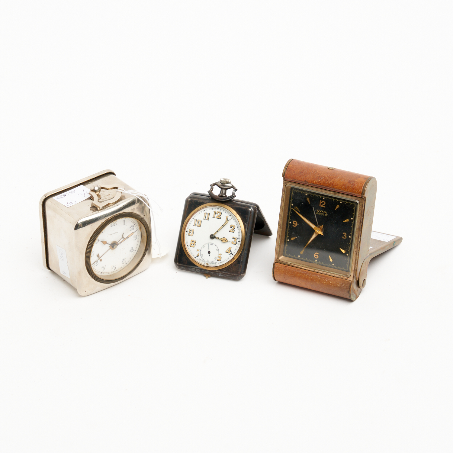 THREE VINTAGE TRAVEL CLOCKS INCLUDING CYMA L.8CM (LARGEST)