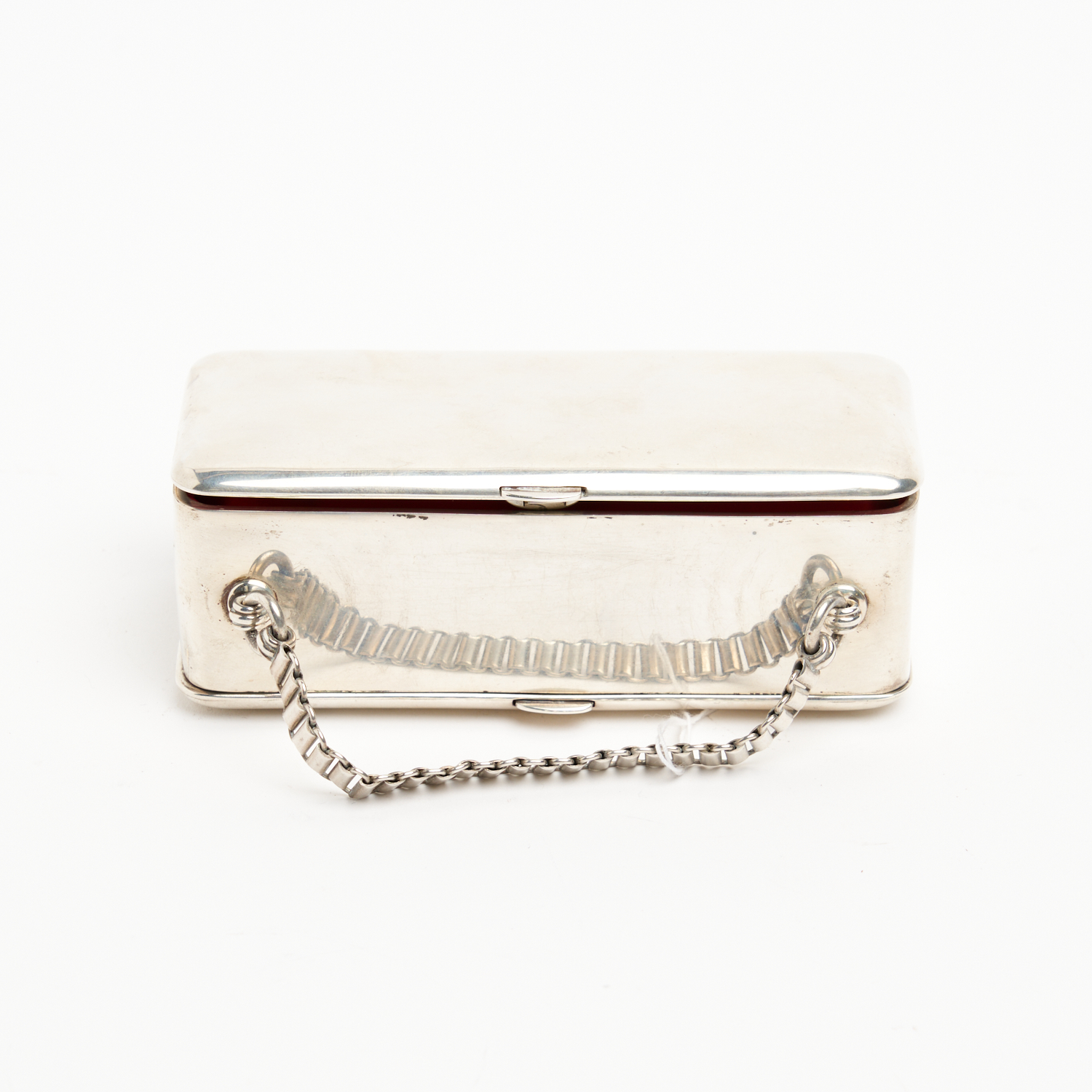 A STERLING SILVER JEWELLERY BOX WITH RED SILK INTERIOR, MIRROR AND CHAIN CARRY HANDLE (MIRROR PRESENT BUT LOOSE IN INTERIOR) L.13CM