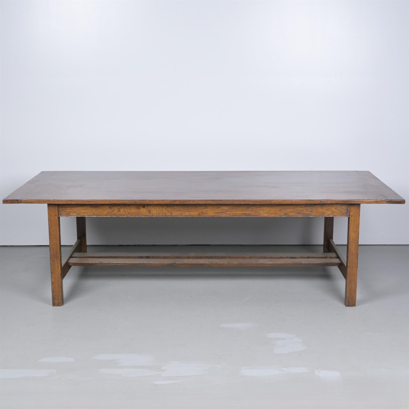 AN OAK DINING TABLE (77H X 270W X 120D CM)(THIS ITEM MUST BE REMOVED BY THE CUSTOMER OR CARRIERS AT THE CUSTOMER'S EXPENSE. LEONARD JOEL STAFF CANNOT ASSIST CARRYING THIS ITEM)
