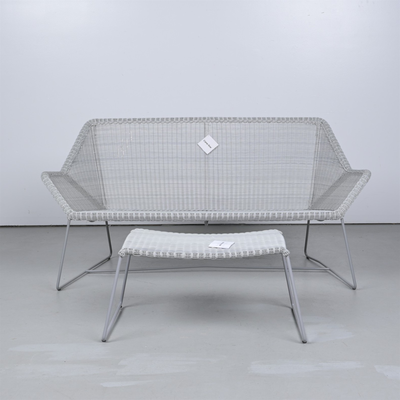 A METAL AND WOVEN ACRYLIC SOFA WITH OTTOMAN BY CANELINE (80H X 153W X 80D CM)(THIS ITEM MUST BE REMOVED BY THE CUSTOMER OR CARRIERS AT THE CUSTOMER'S EXPENSE. LEONARD JOEL STAFF CANNOT ASSIST CARRYING THIS ITEM)