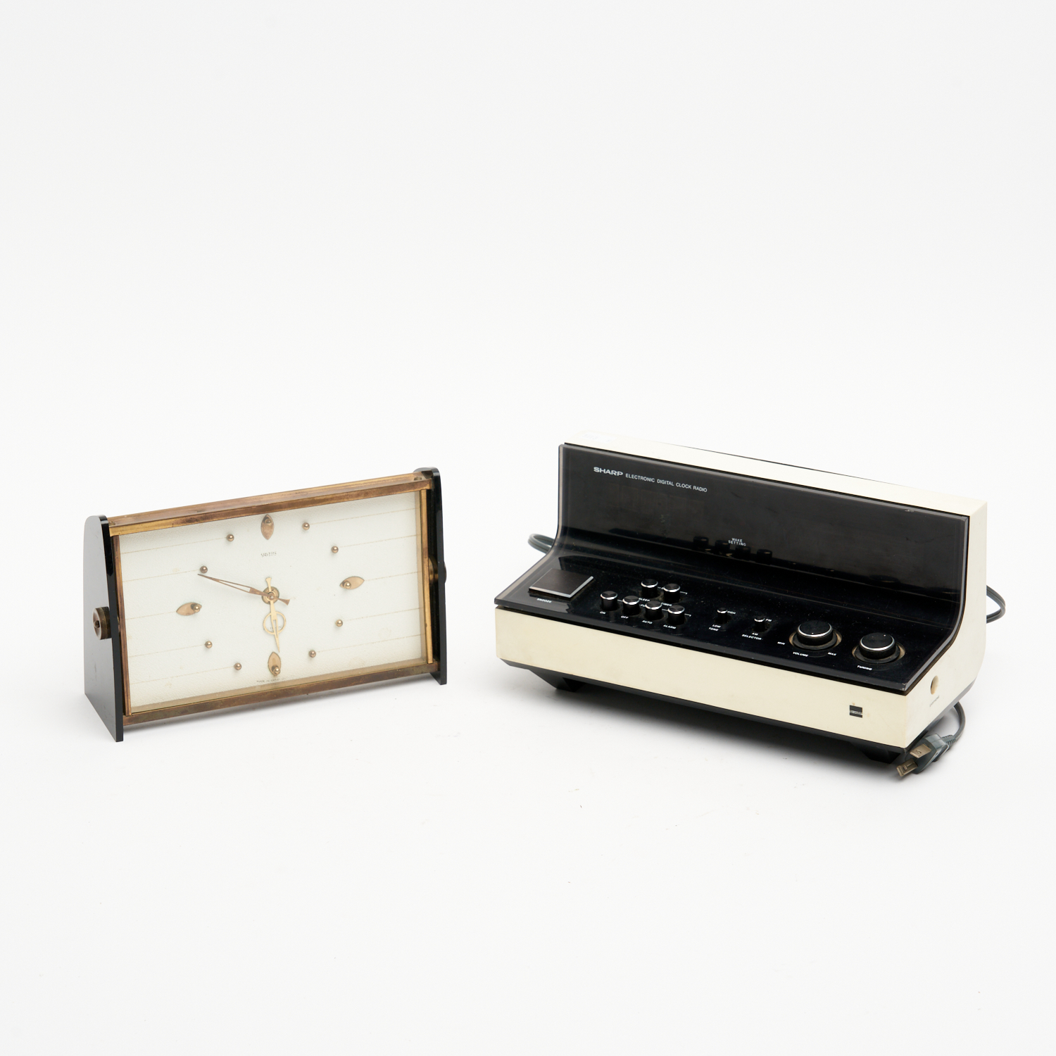A VINTAGE SMITHS BRASS MECHANICAL MANTEL 8 DAY CLOCK WITH A VINTAGE JAPANESE SHARP DIGITAL CLOCK RADIO W.22CM