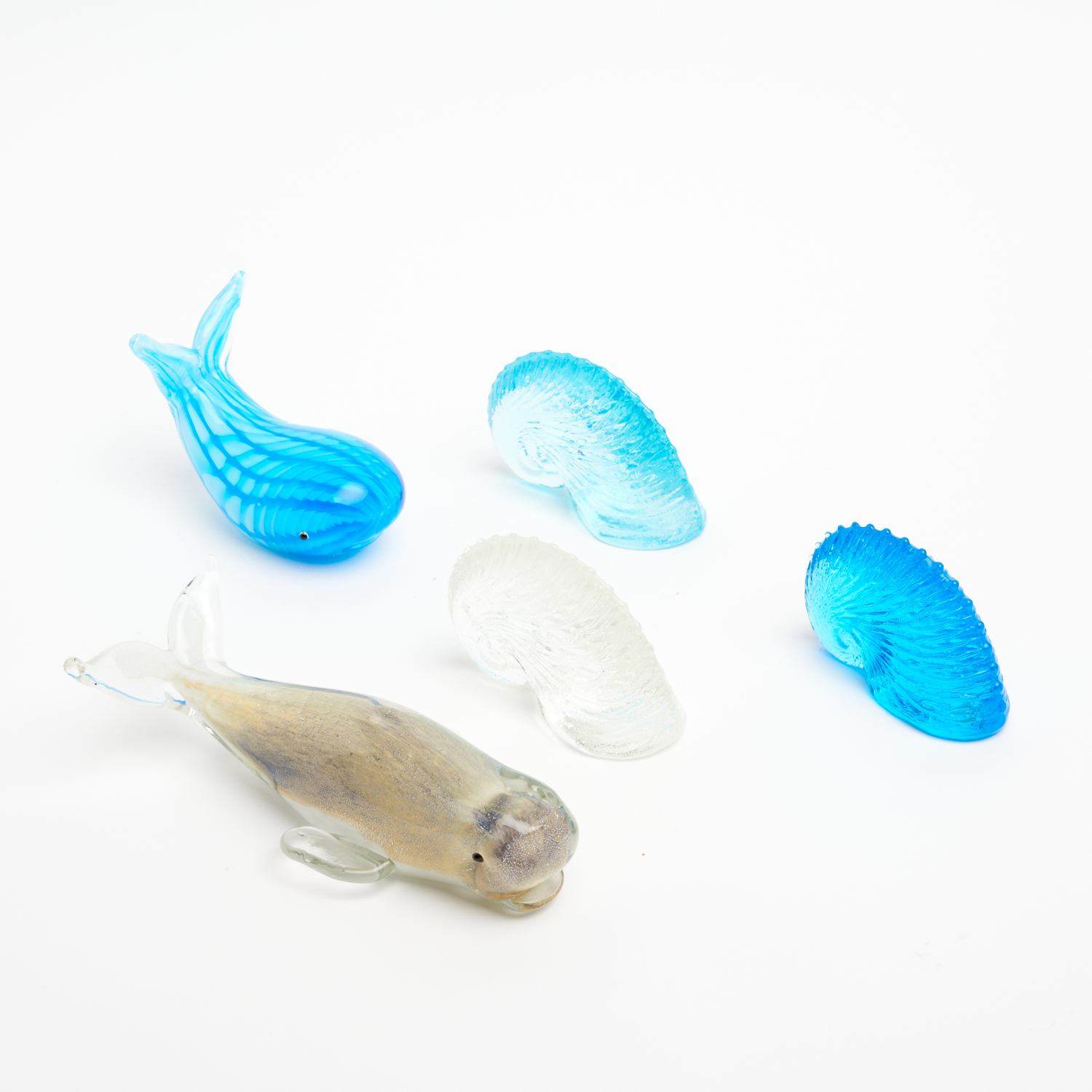 A PAIR OF ART GLASS WHALES WITH THREE GLASS NAUTLIUS SHELLS IN BLUE TONES W.23CM